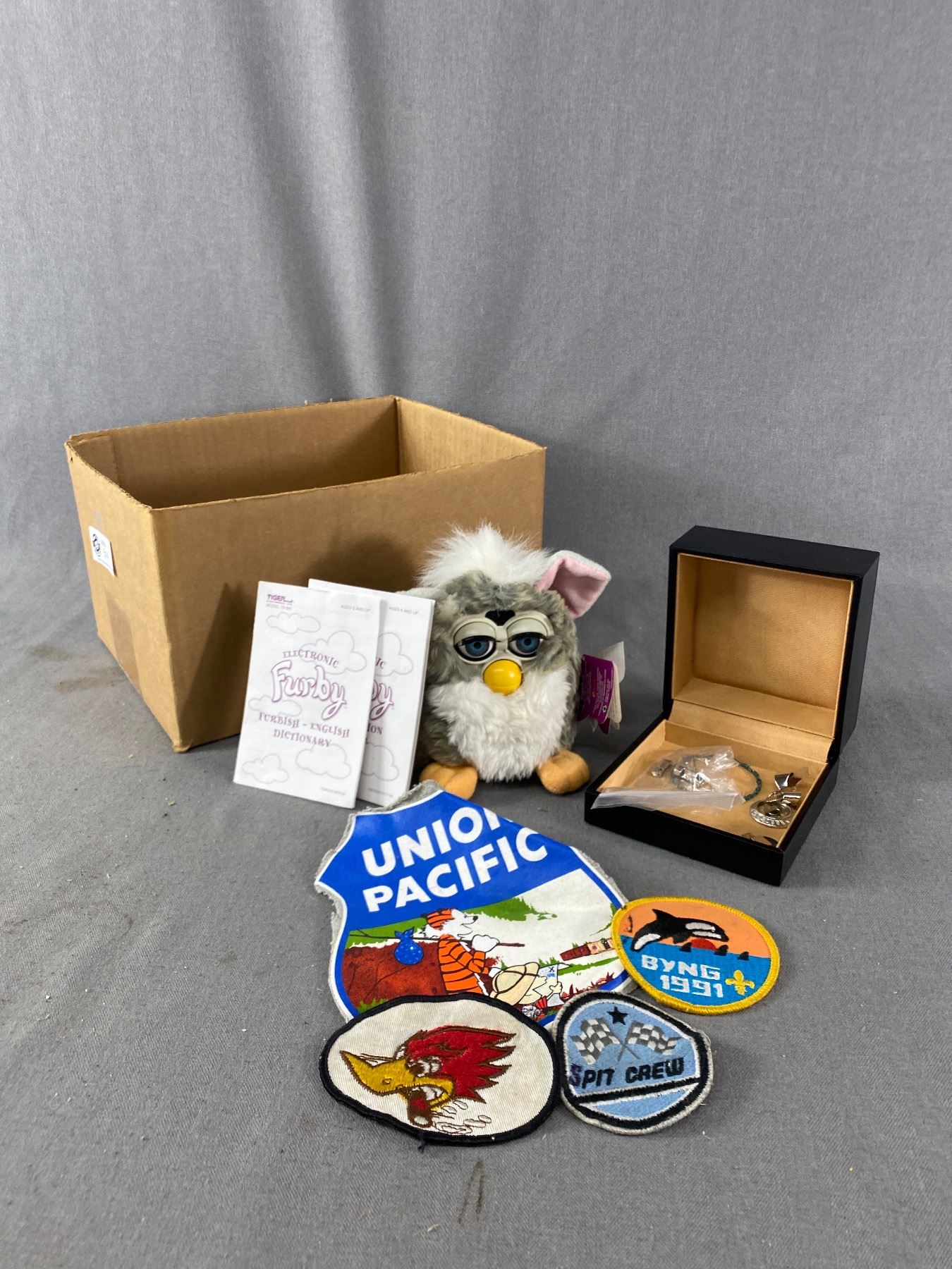 Assorted Lot Of Patches, Buttons Pins & Electronic Animated Furby Toy