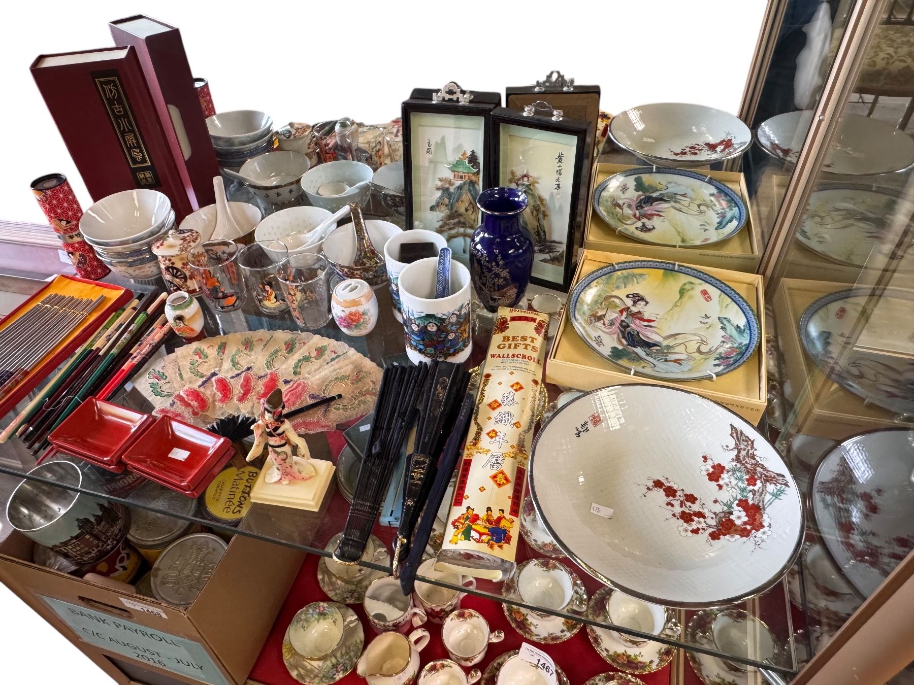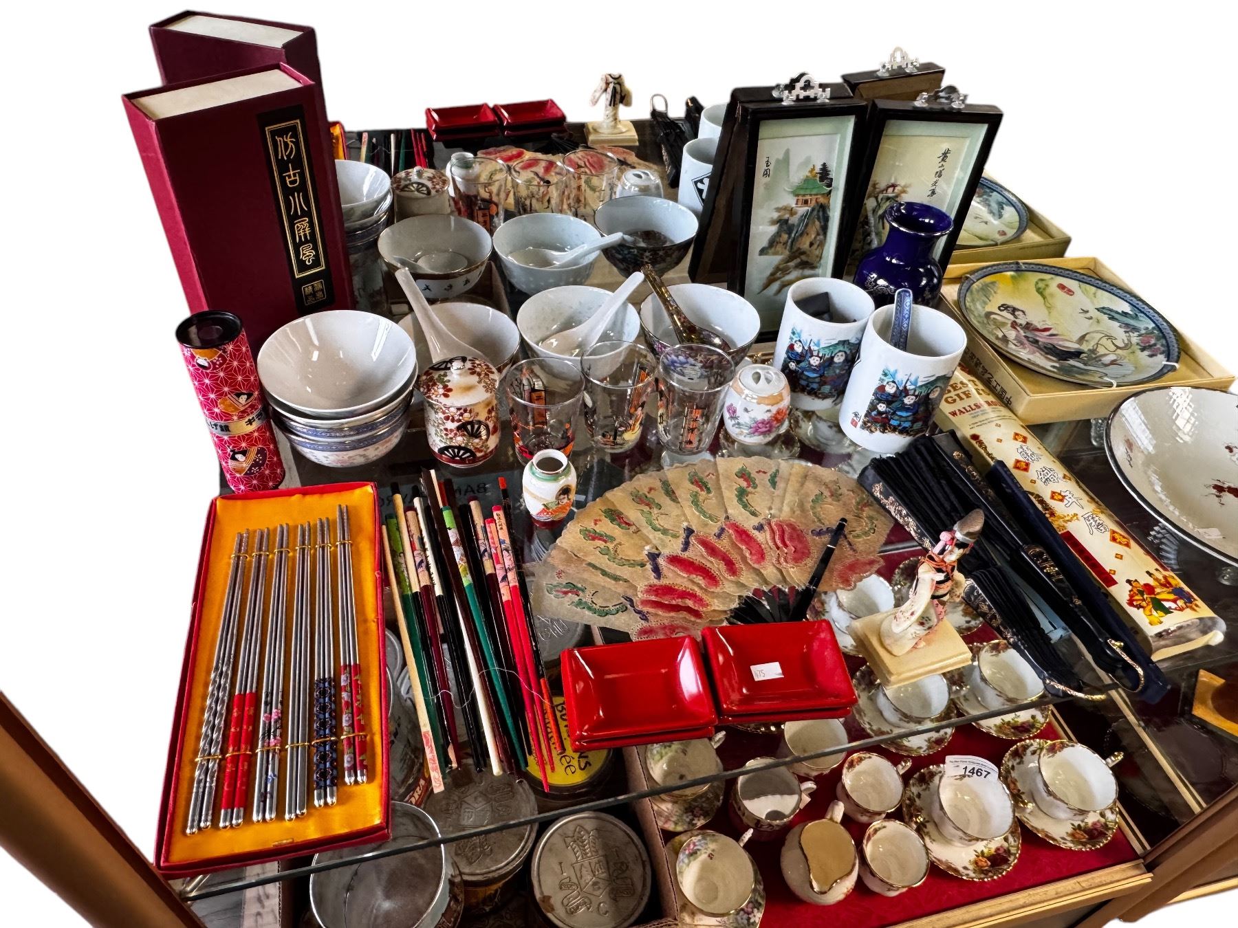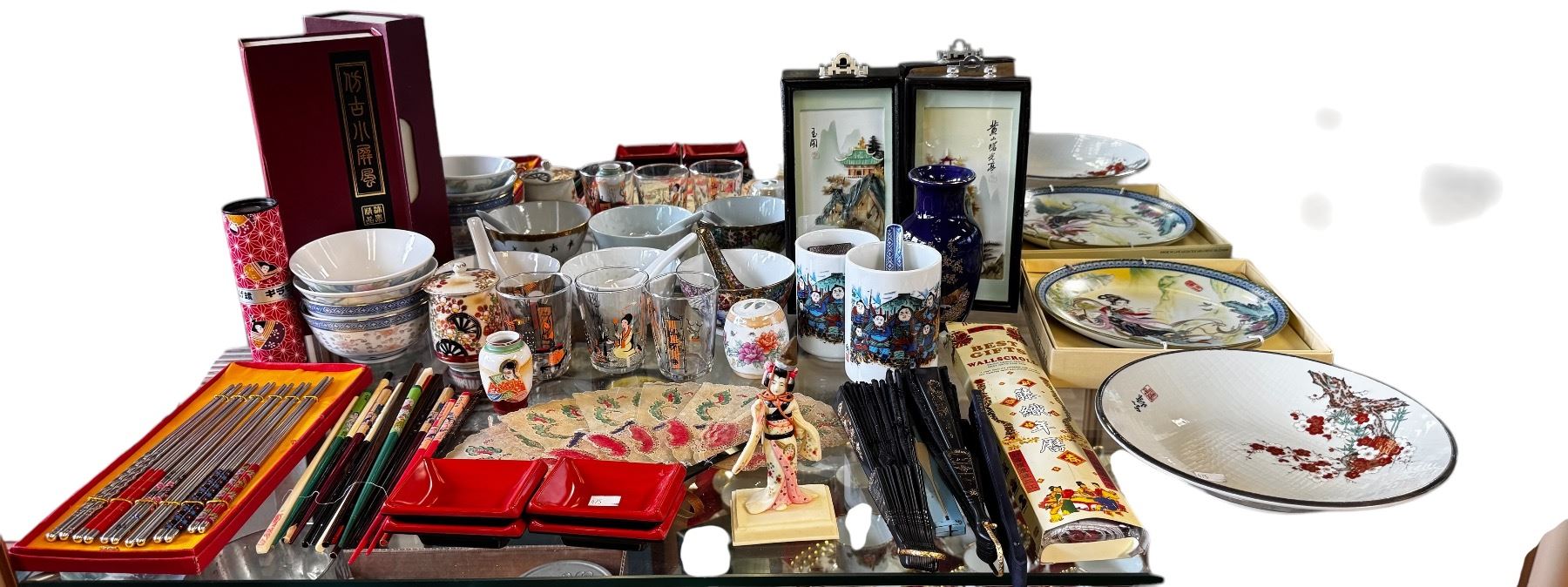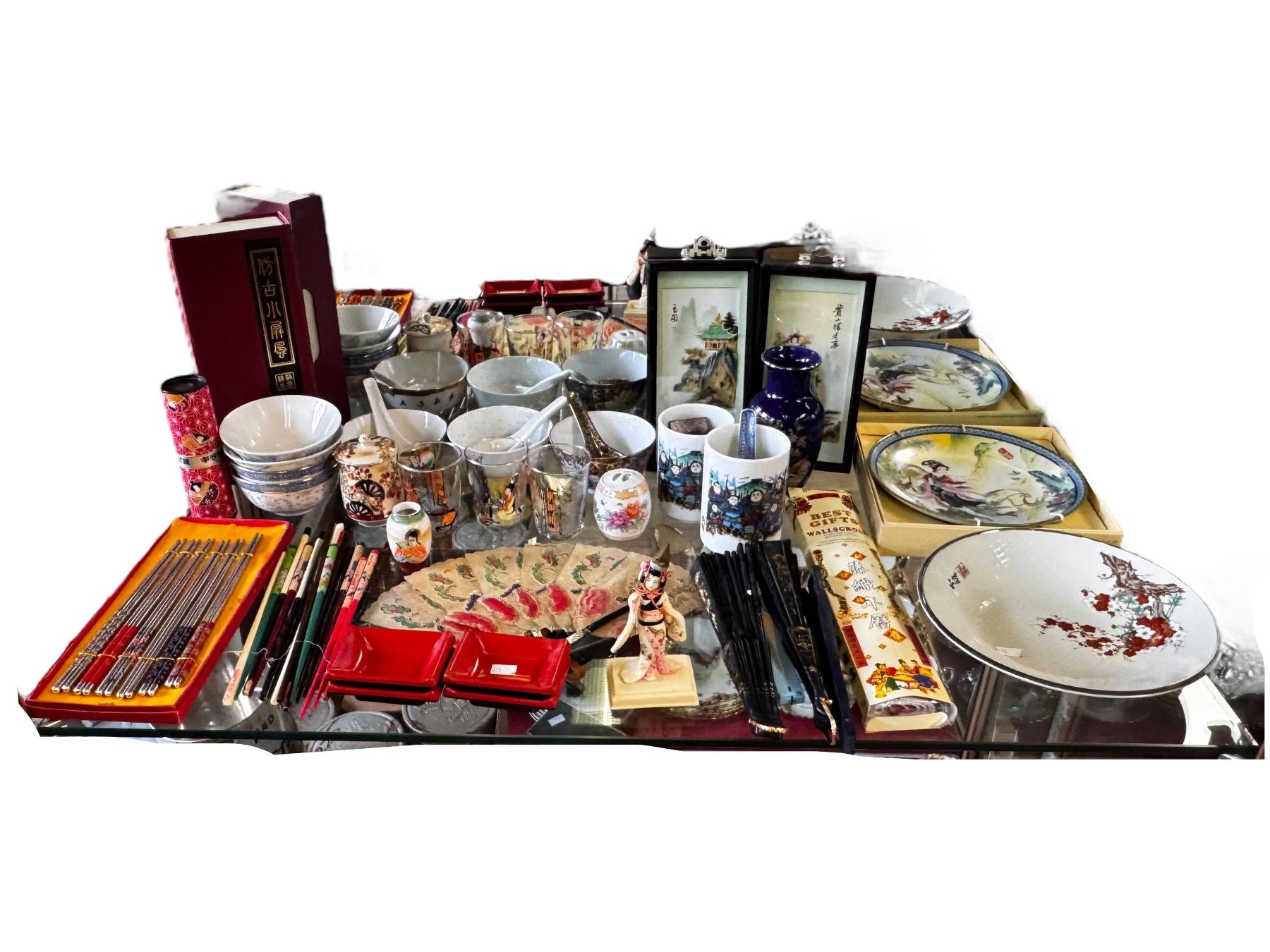 Assorted Lot of Japanese Collectables Bowls, Dishes, Fans, Chopsticks, Pictures and more