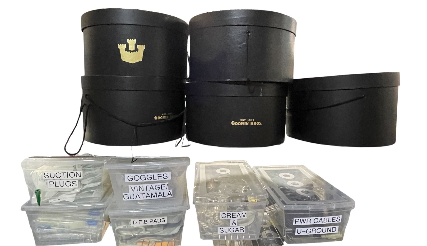 Assorted Movie Props: 5 Goorin Bros Hat Boxes (with Fedora) + Medical Bins (Suction Plugs, D‑Fib Pads) + Sony Camera & Selphy