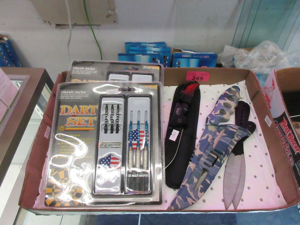 Set of 3 throwing knives, 2 packs of darts, folding knife and Camo knife.
