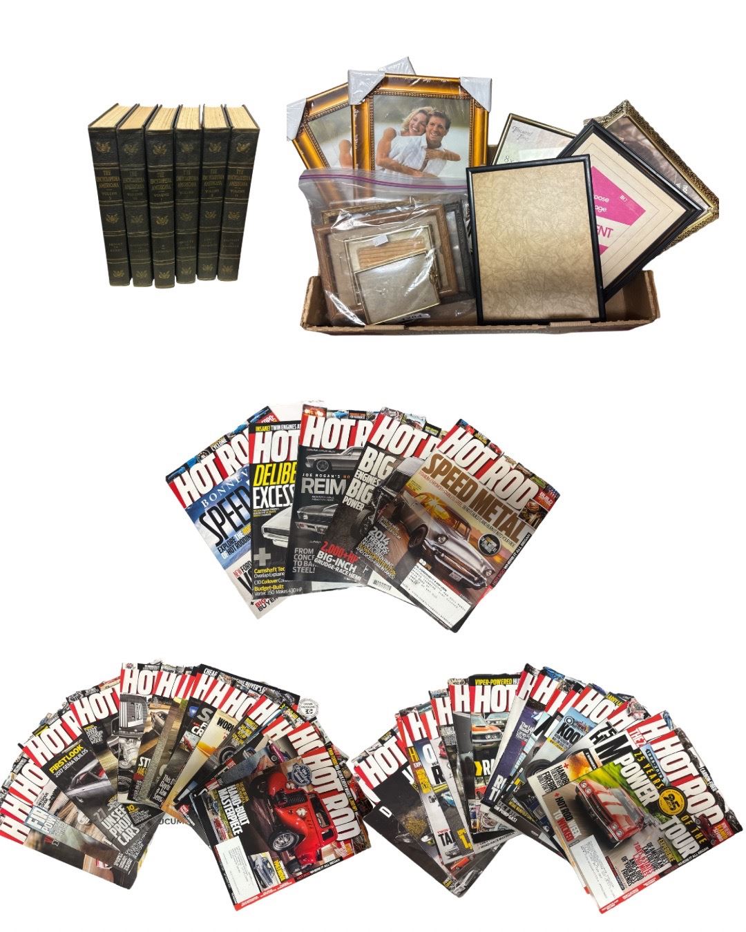 Assorted Picture Frames, Hot Rod Magazines, & Encyclopedias