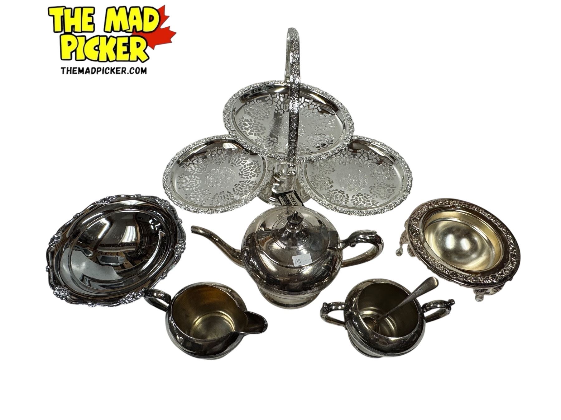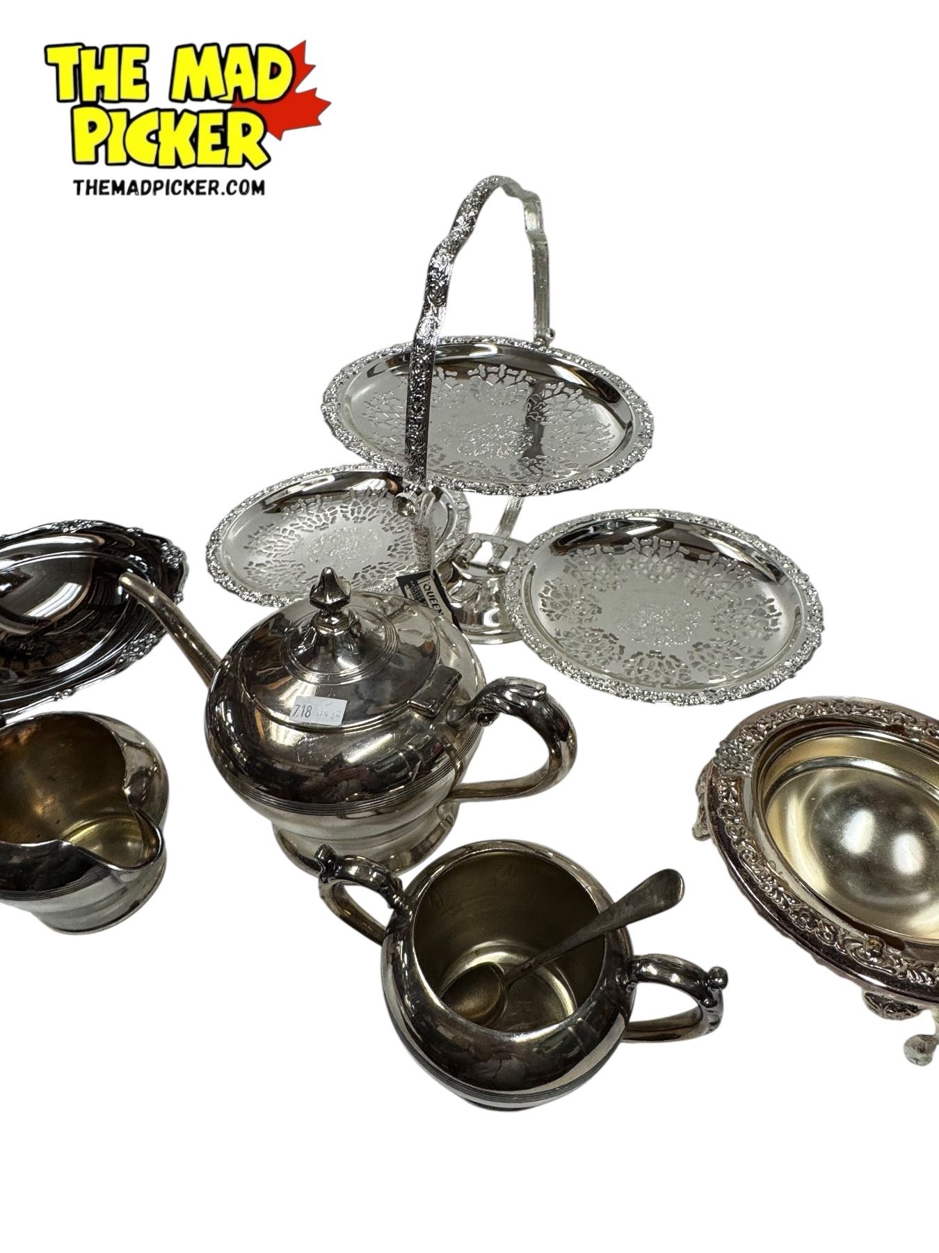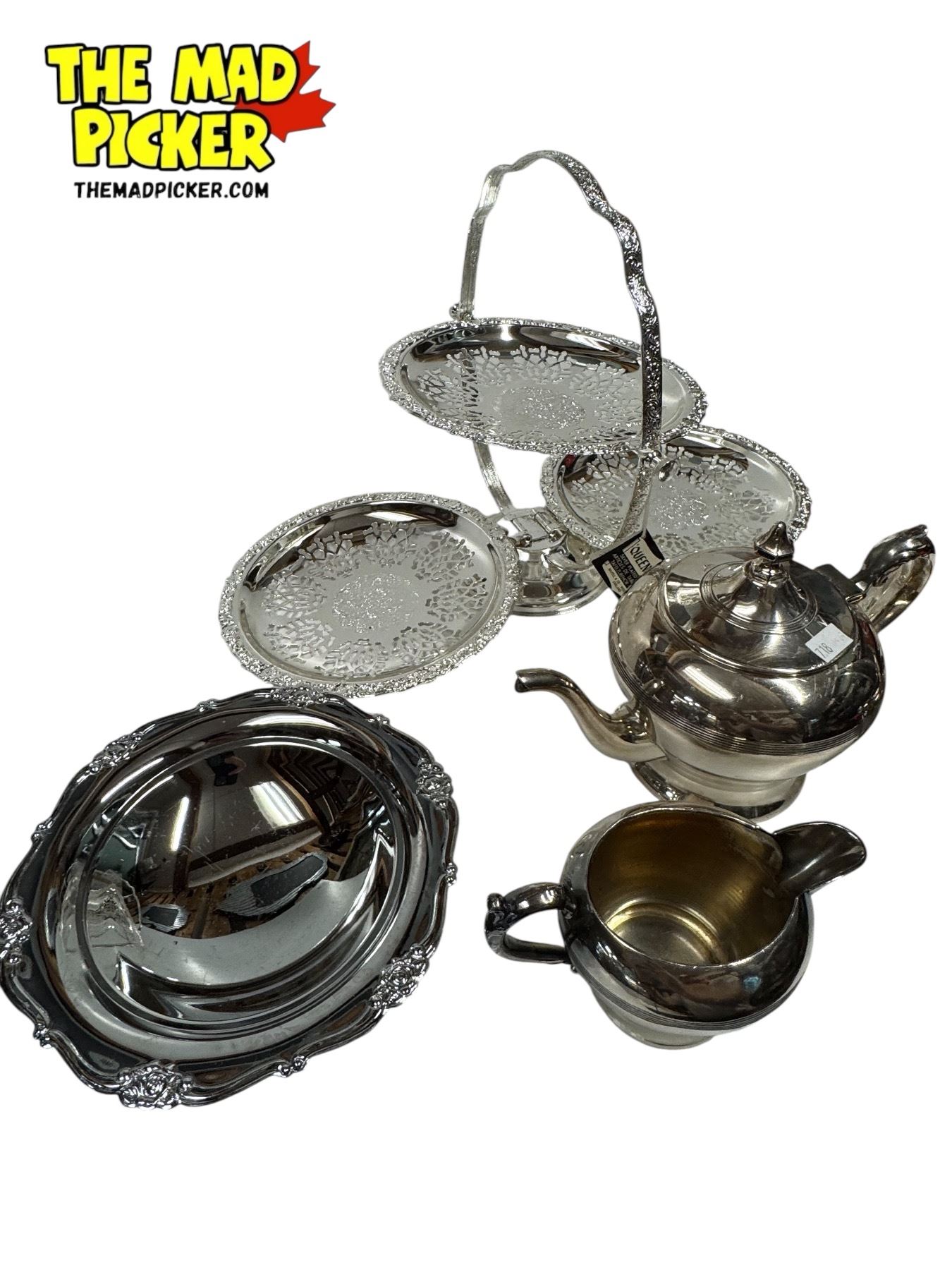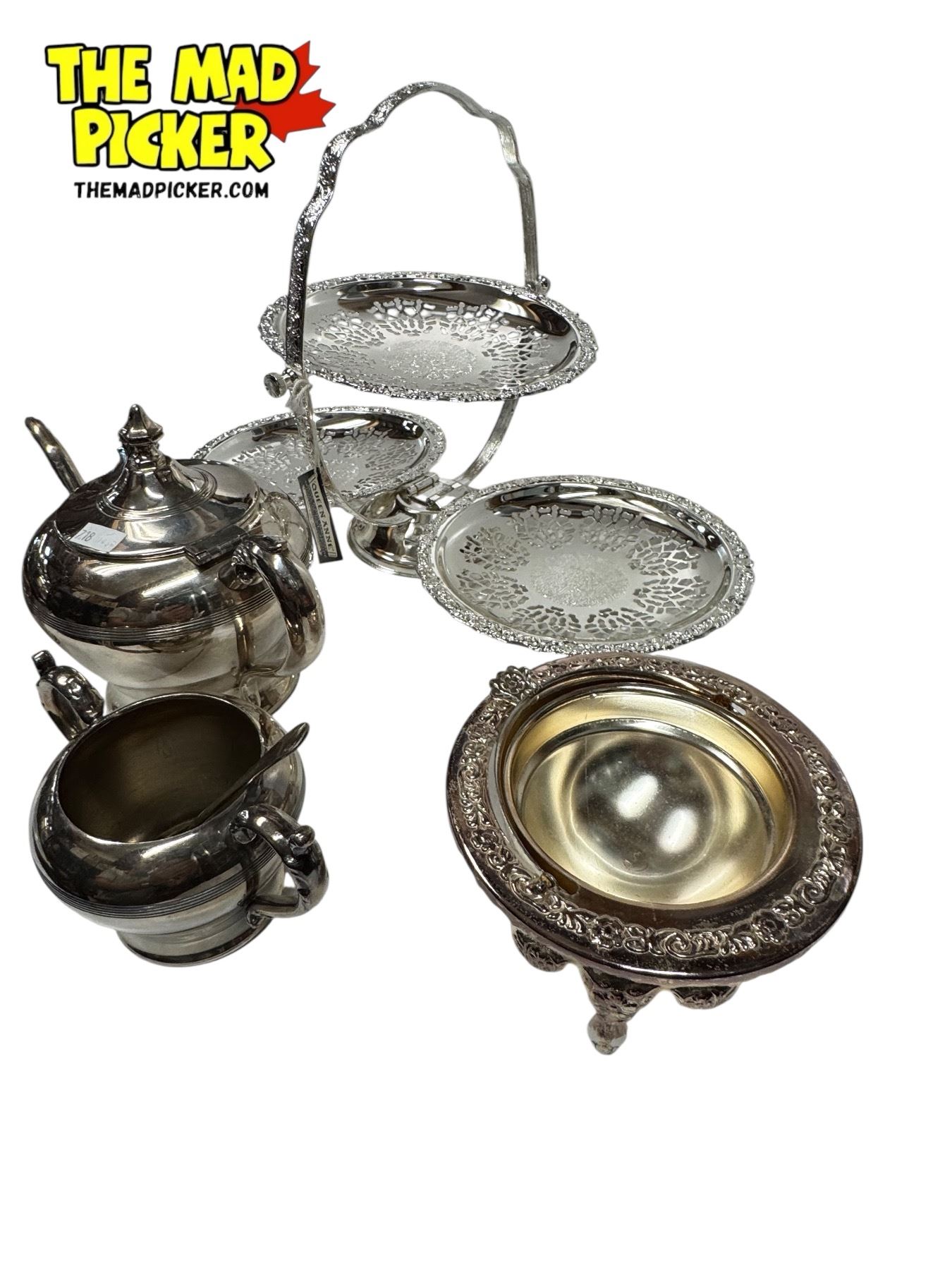 Assorted Plated Items: Cake Plate, Teapot, Sugar, Creamer, & More