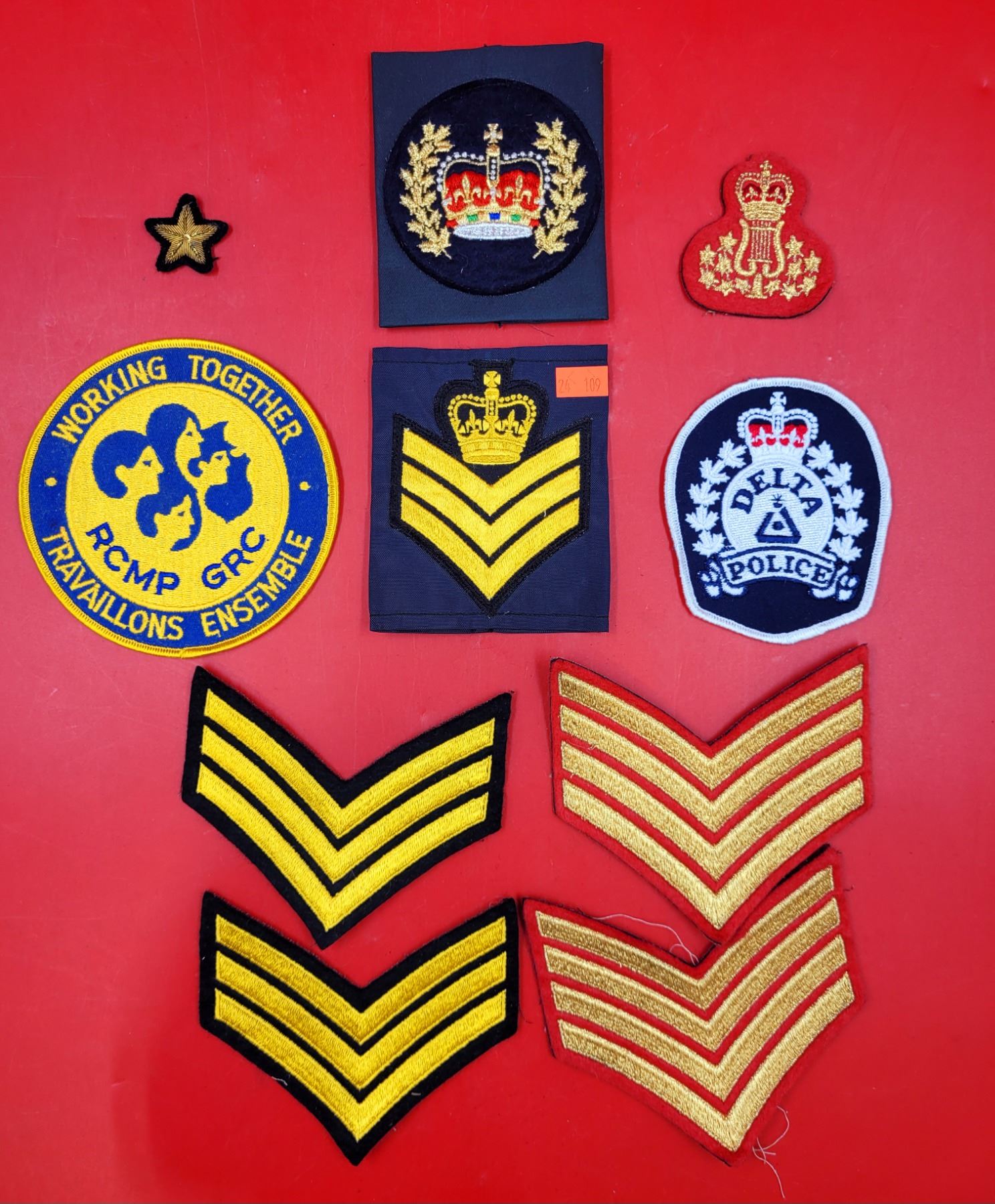 Assorted Police/Military Patches w/ Rank Insignias, Delta Police Patch, RCMP Patch, & More