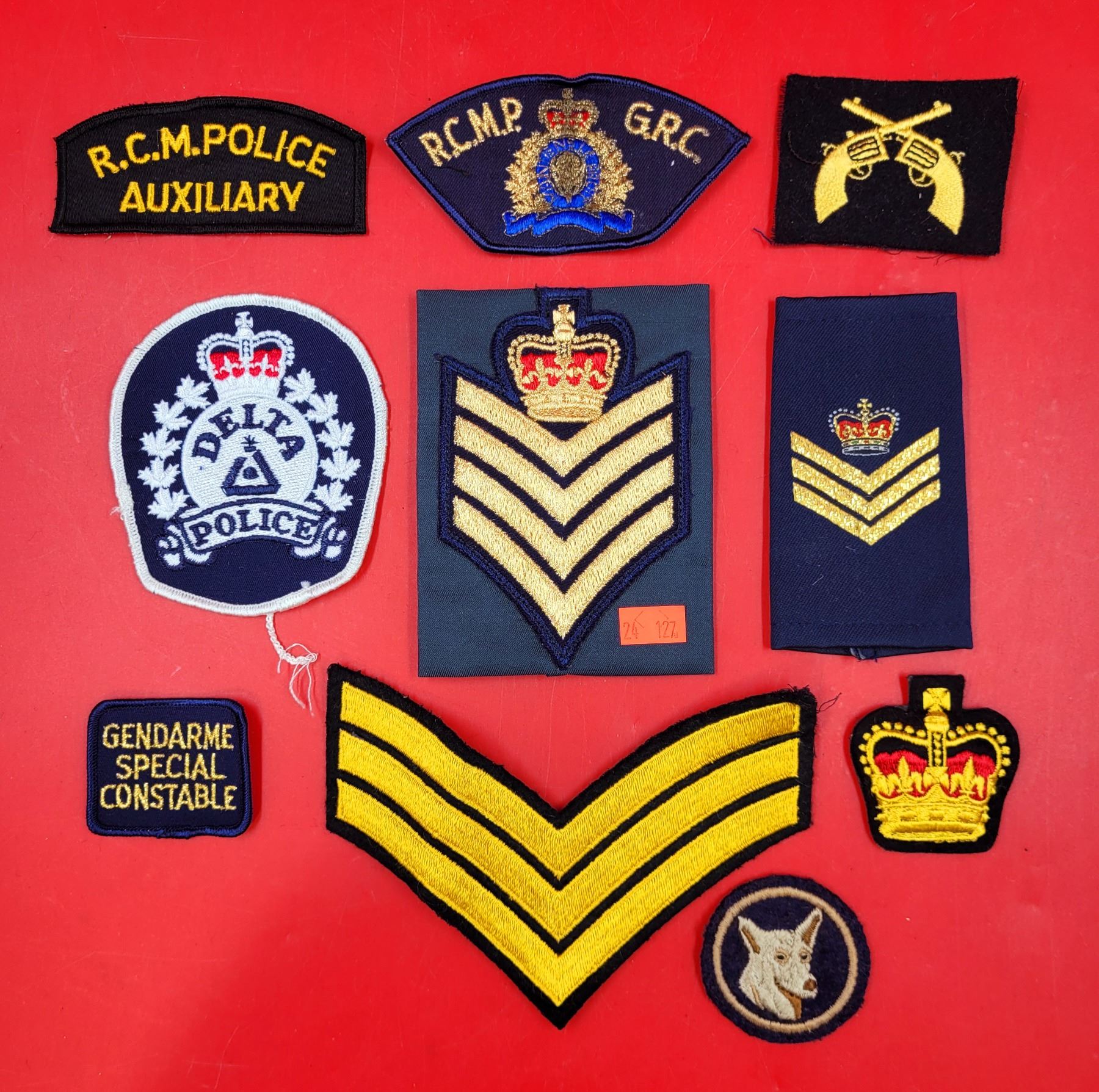 Assorted Police/Military Patches w/ Rank Insignias, RCMP Patches, Delta Police Patch, & More