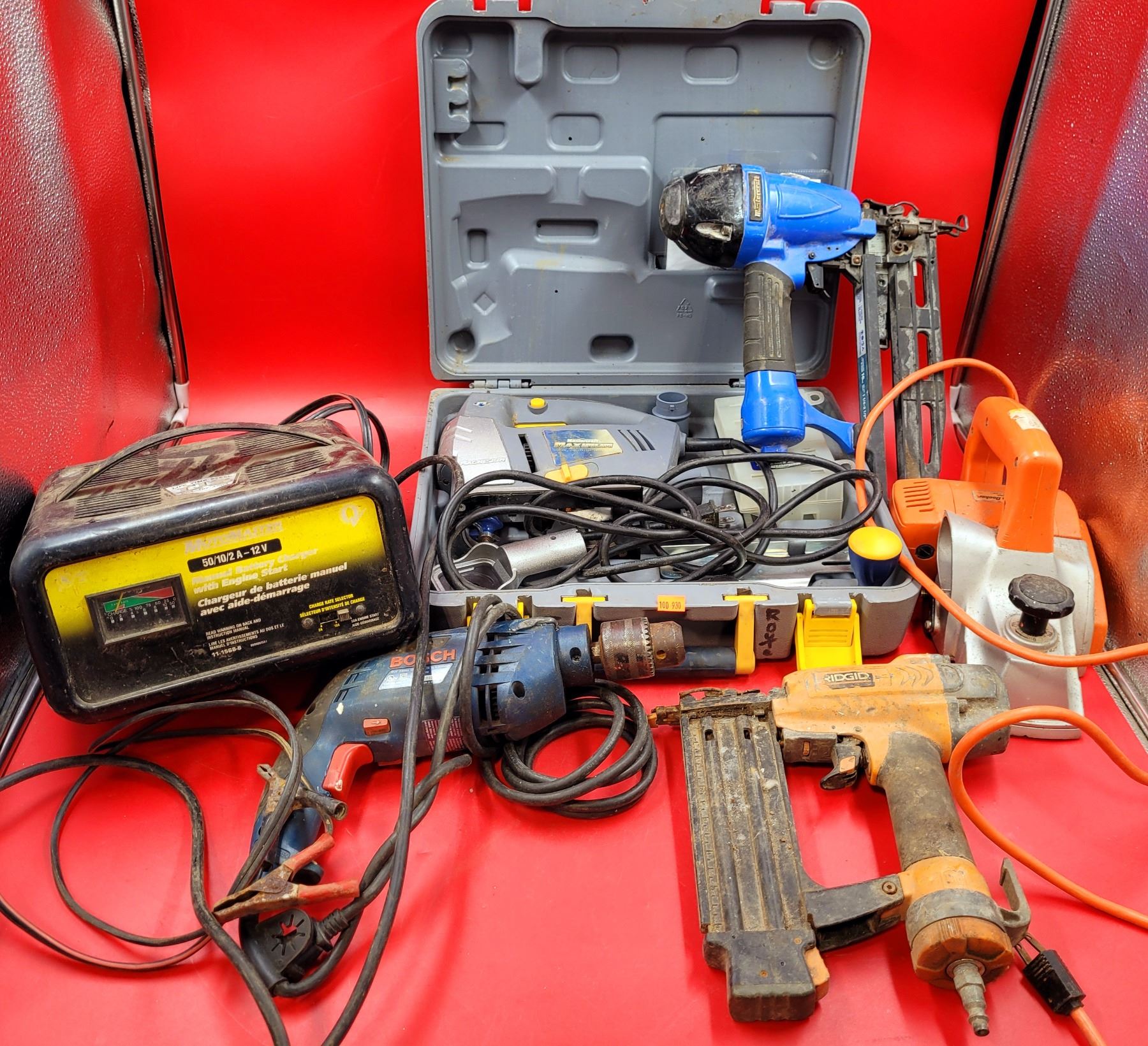 Assorted Tool Lot w/ MotoMaster Battery Charger, Black & Decker Planer, Bosch Hammer Drill, & More