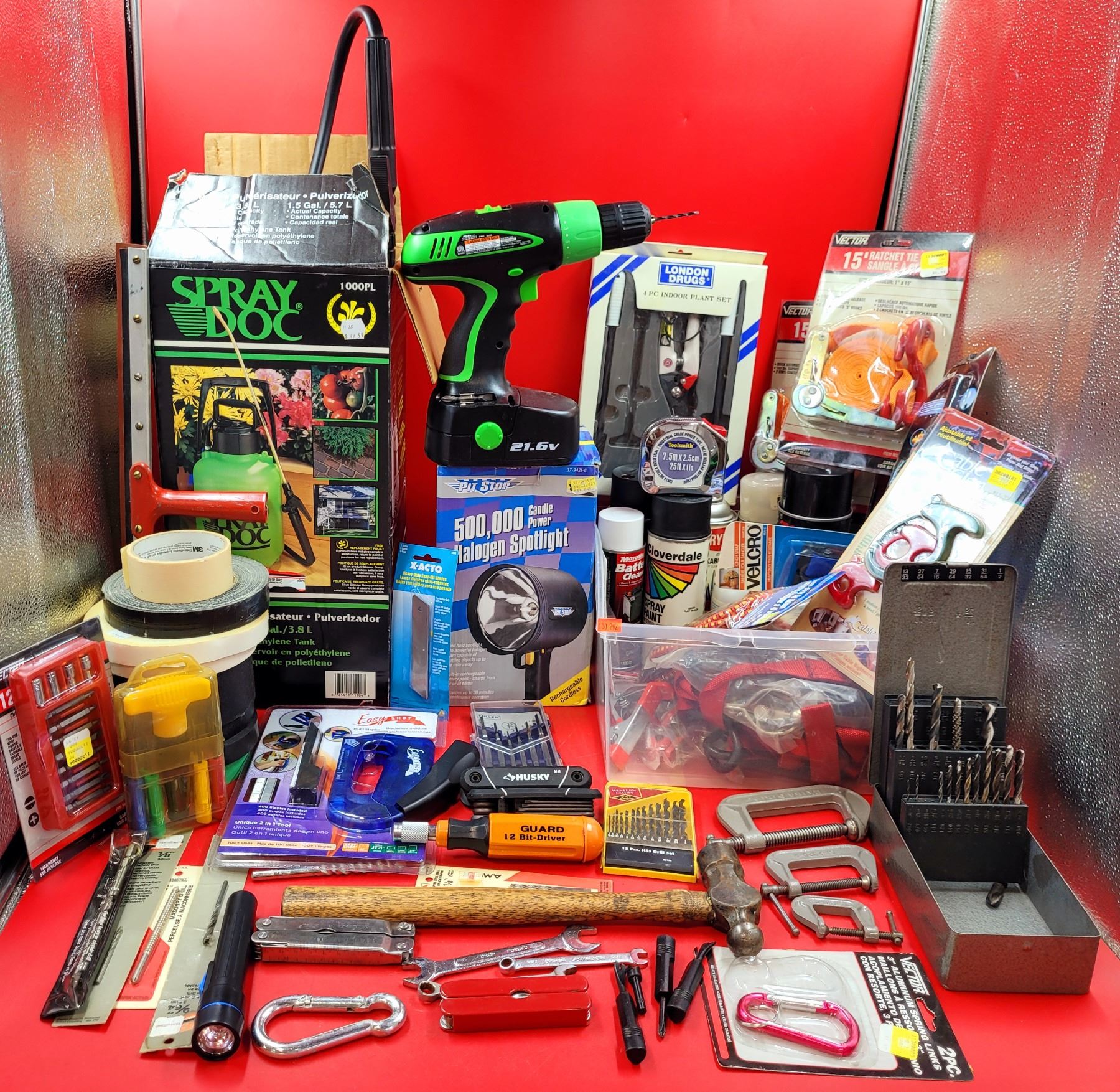 Assorted Tool Lot w/ Power Drill, Clamps, Ball Peen Hammer, Drill Bits, & More