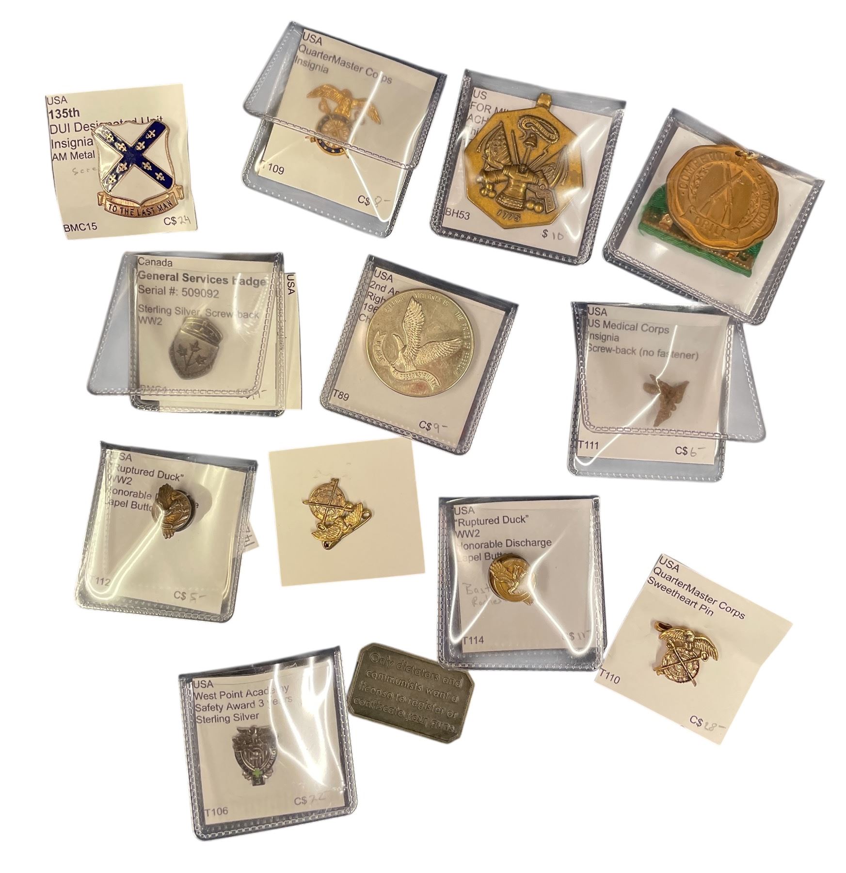 Assorted Vintage Canadian / USA Military Collectible: Pins, Coin, Medal