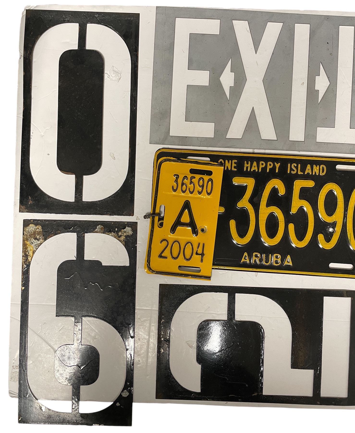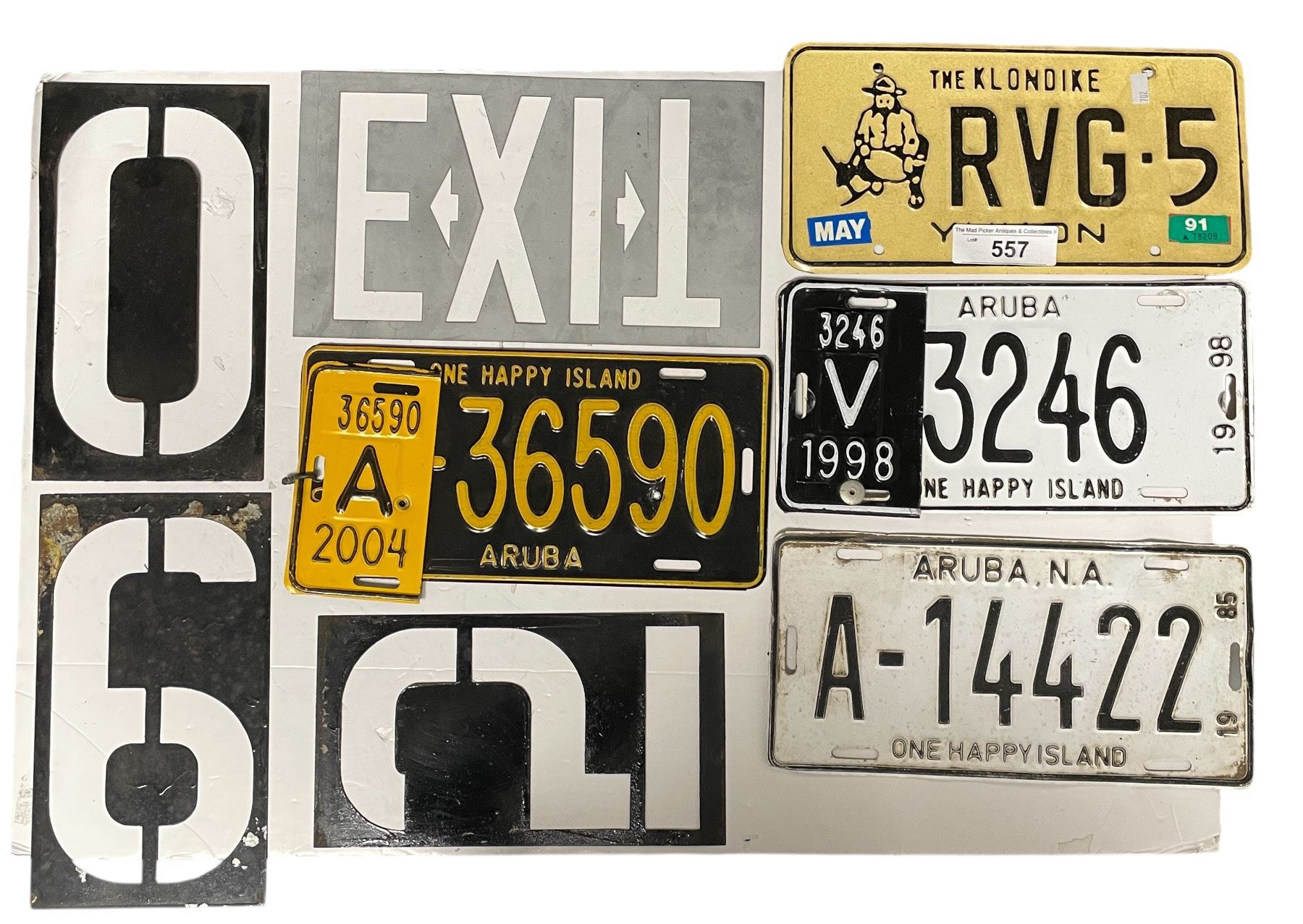 Assorted Vintage License Plates, Train Number Decals, & Exit Sign Decal (The Klondike, & Aruba)
