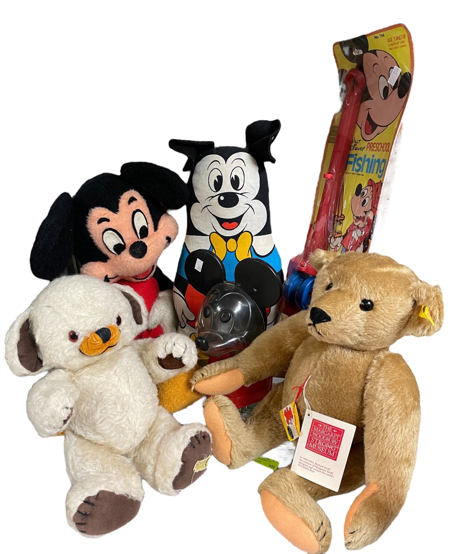 Assorted Vintage Toys: Mickey Mouse, Steiff Bear, Merry Thought Bear, Mickey Mouse Fishing Rod, & More