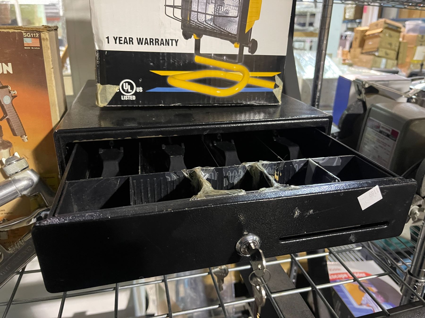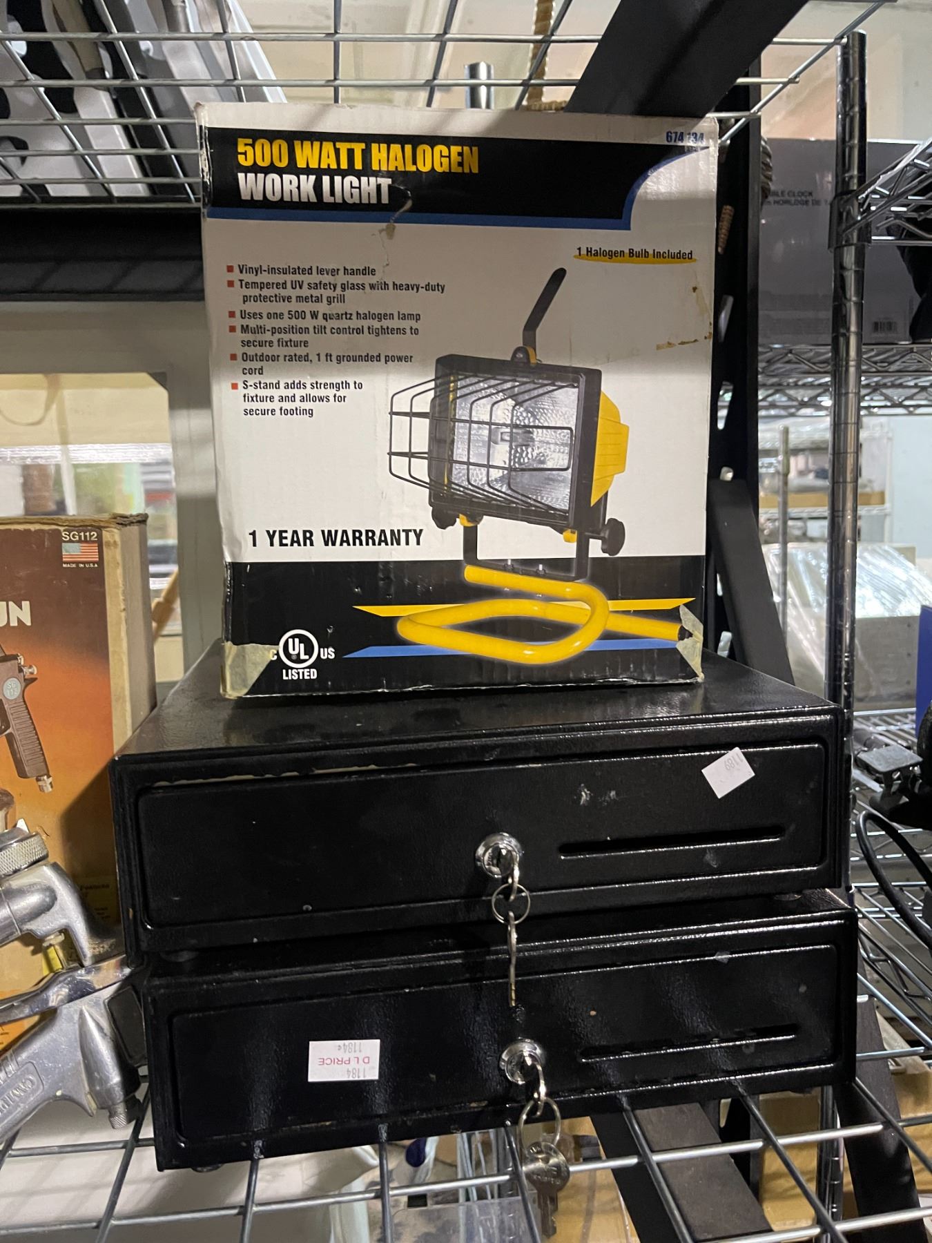 Assorted Workshop Tools - 2 Spray Guns, 500W Halogen Work Light, and 2 Cash Drawers