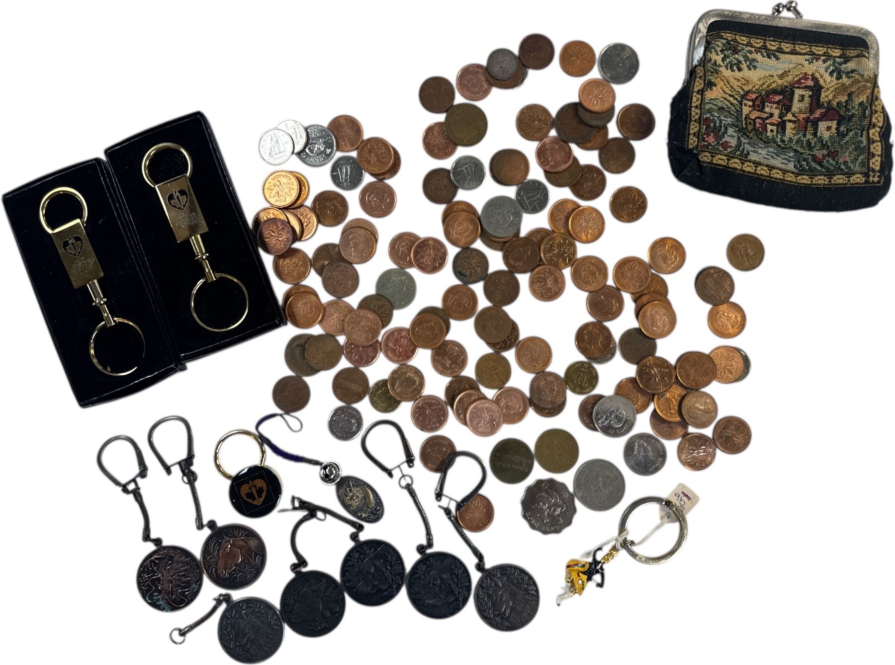 Assorted World Coins, Needle Point Coin Purse, Assorted Key Rings