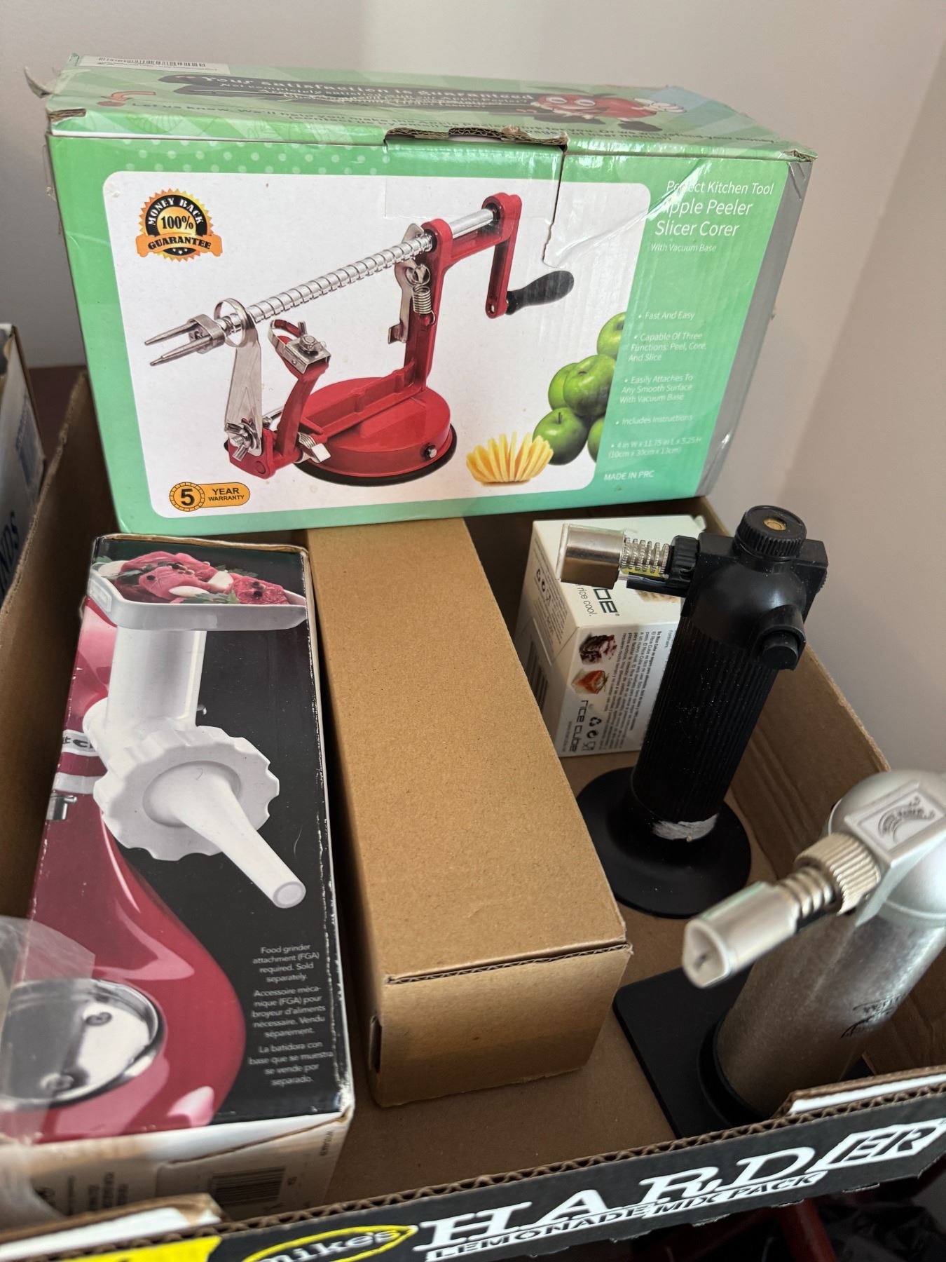 Assorted kitchen items, rice, cube, apple peeler, slicer, core, and other