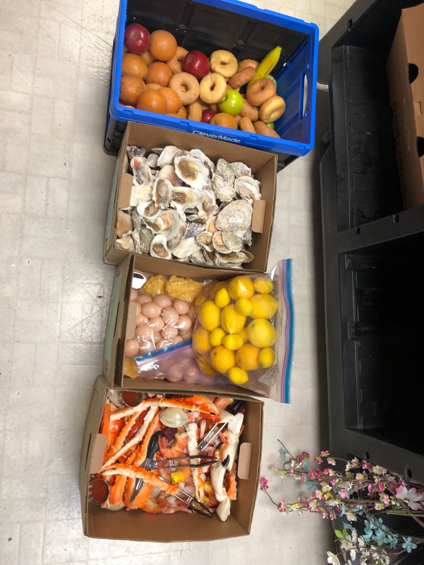 Assortment of artificial food - shell fish/ eggs/ lemons/ scrambled eggs/ oysters/ bagels/ oranges/