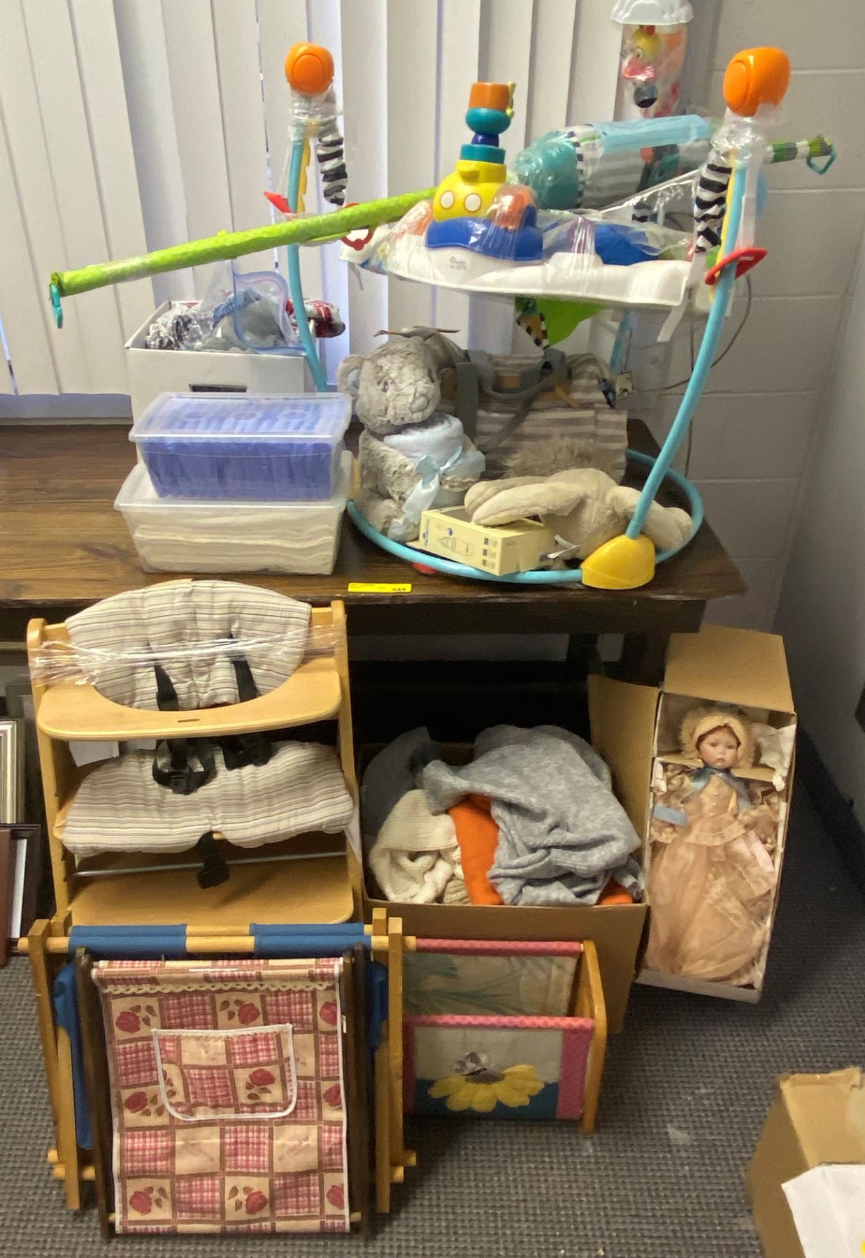 Assortment of baby clothing/ baby toys/ baby Einstein/ jolly jumper/ wooden baby high chair etc.