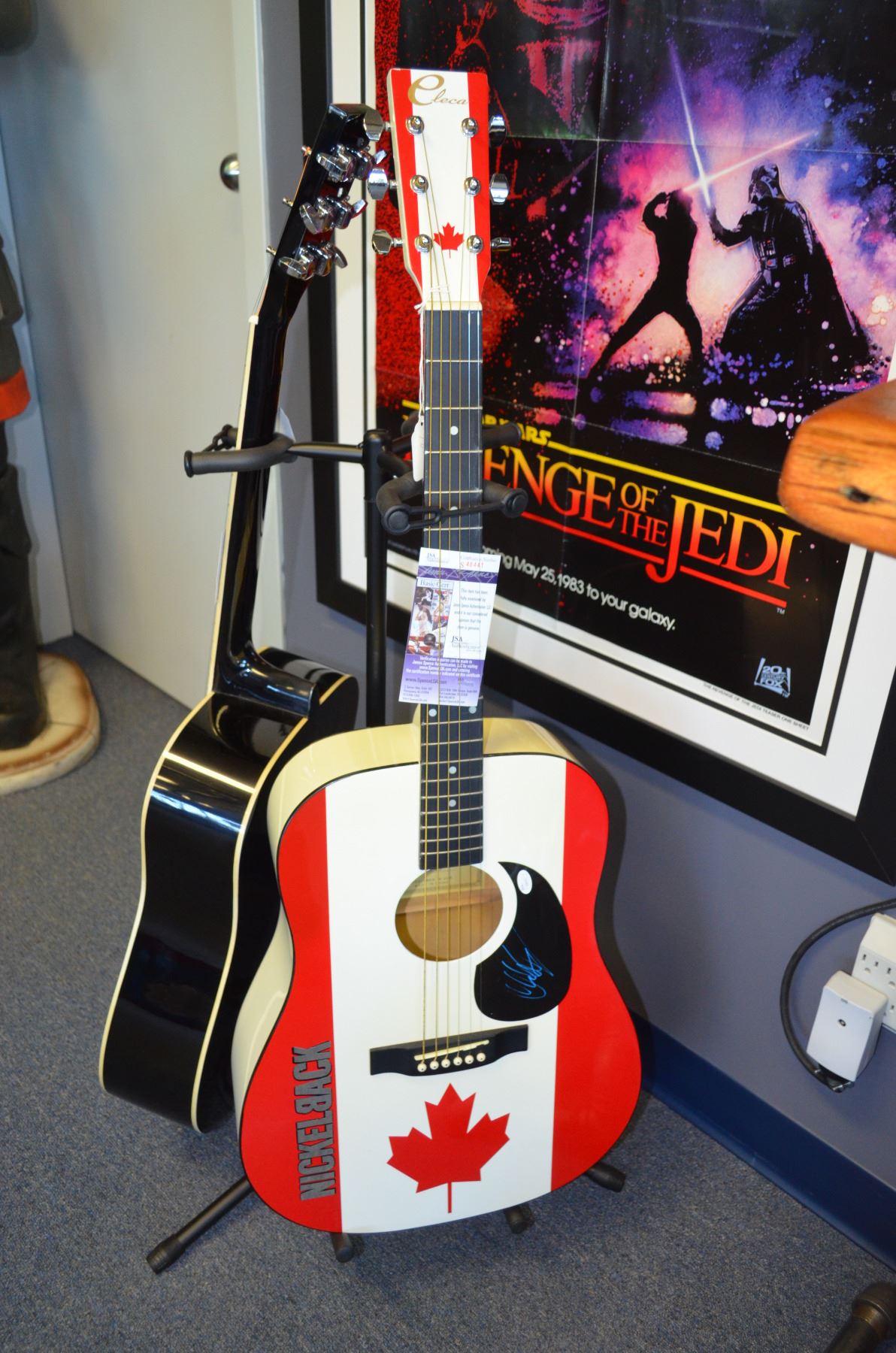 Full-size Eleca acoustic guitar hand signed on the pick guard by Chad Kroeger, in blue fiber-tip pen. The autograph includes an official James Spence Authentication (JSA) hologram and matching COA for authenticity purposes. Authentication: JSA COA