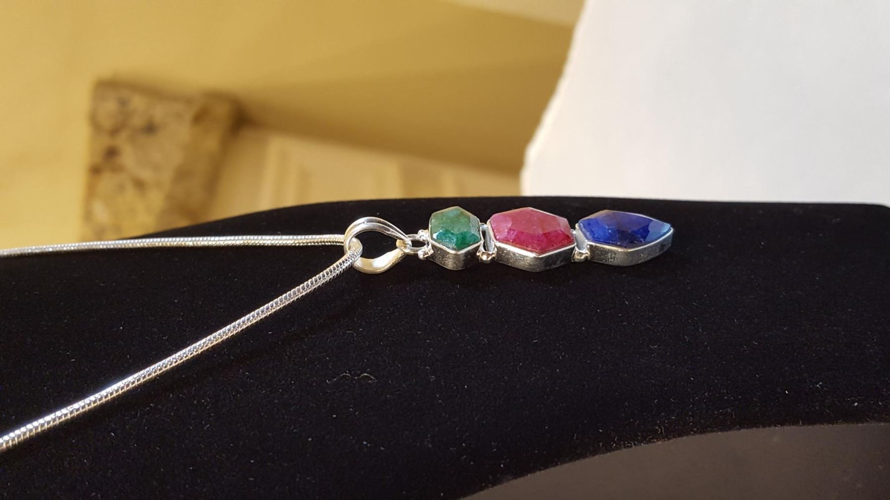 Awesome 8.50 cttw Ruby,Emearald & Sapphire Pendant. Mounted In .925 Sterlins Silver. Includes 20" 2 mm Chain. Choice Piece. 84 cttw