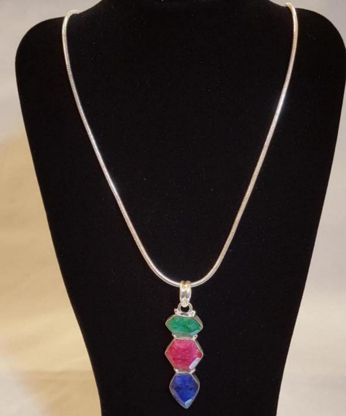 Awesome 8.50 cttw Ruby,Emearald & Sapphire Pendant. Mounted In .925 Sterlins Silver. Includes 20" 2 mm Chain. Choice Piece. 84 cttw