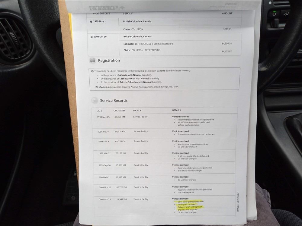 5sp Manual transmission and 2.3 Litre Engine, 4 cylinder , Front Wheel Drive, 269,276 Kms TMU, Red, 4 PassengerDeclarations - Previously Out of Province, SK,AB , Currently BC Registered,, Damage Claims, 2 CLAIMS TOTAL $4360 , Power Steering, Power Brakes,, Intermittent Wipers, AM/FM Stereo , Rear Defroster, Bucket Seats, Anti Lock Brakes, Front Disc Brakes-Air Conditioning, Power Windows, Power Locks, Tilt Steering, Cruise Control, Alloy Wheels, Anti Theft, Power Sunroof, CD Player, Aftermarket Stereo, Heated Mirrors, Spare Key, Auction Notes : Power Mirrors, Carfax Shows Water Pump + Timing Belt Replaced @247876kms, Exhaust Replaced @266515kms, Spare Key, Odometer Stopped, Selling As True Milage Unknown, Consignor Declares New Front & Rear Brakes (Calipers, Rotors & Master Cylinder)