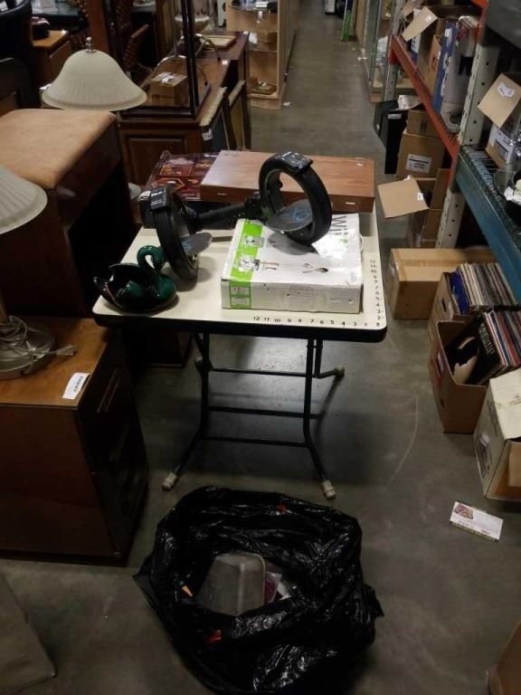 BAG OF AMAZON OVERSTOCK ITEMS, BLUE MOUNTAIN SWAN DISH, WOOD PUZZLES AND GAMES AND X8 ROLLING INLINE BOARD