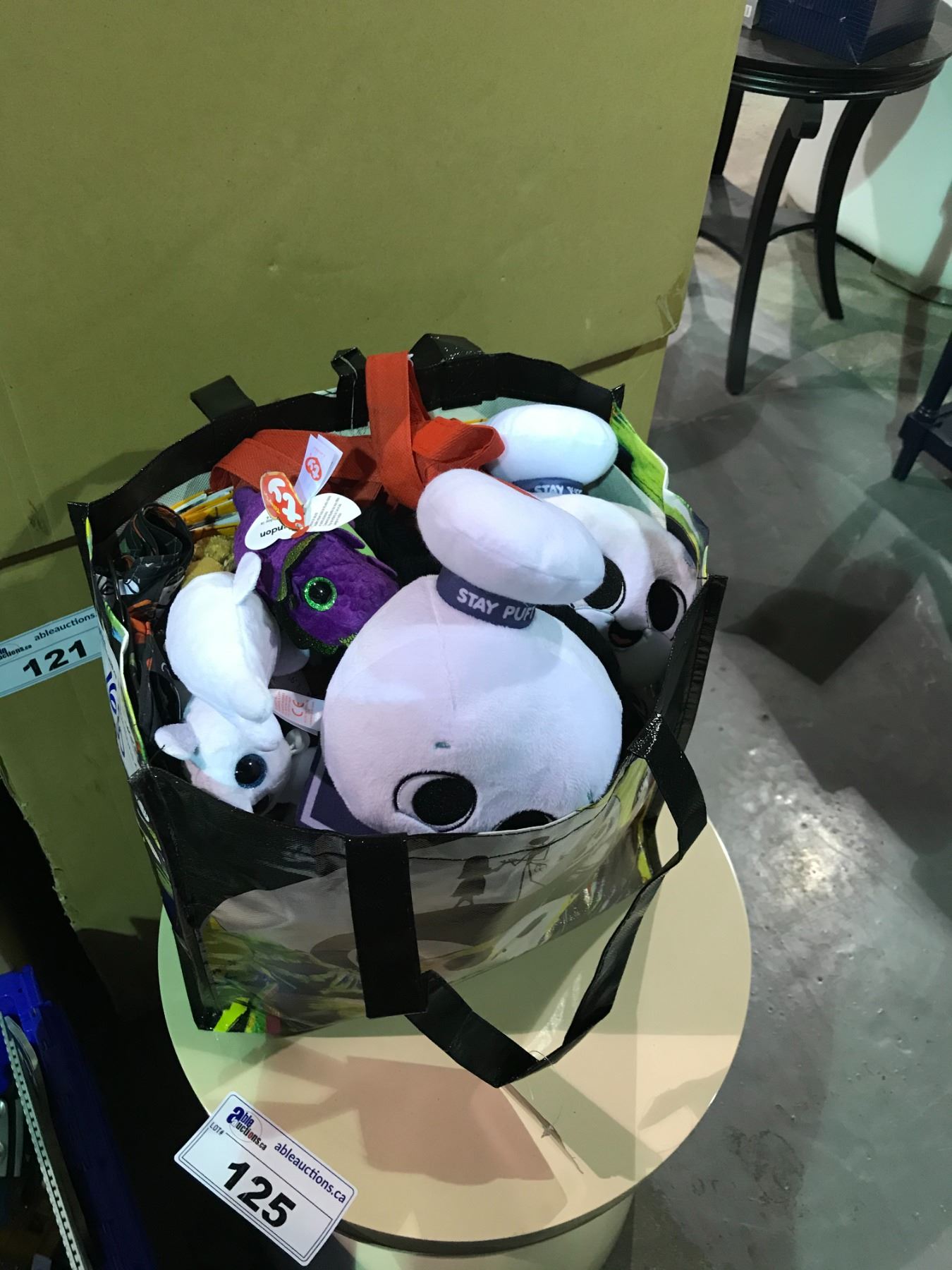 BAG OF ASSORTED NEW WITH TAG PRODUCTS: TY BEANIE BABIES, MARVEL HAT, REUSABLE BAGS, & MORE