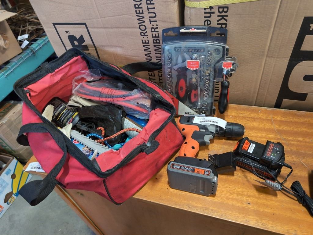 BAG OF ASSORTED TOOLS INCLUDING BLACK AND DECKER 20V CORDLESS DRILL WITH BATTERY AND CHARGER