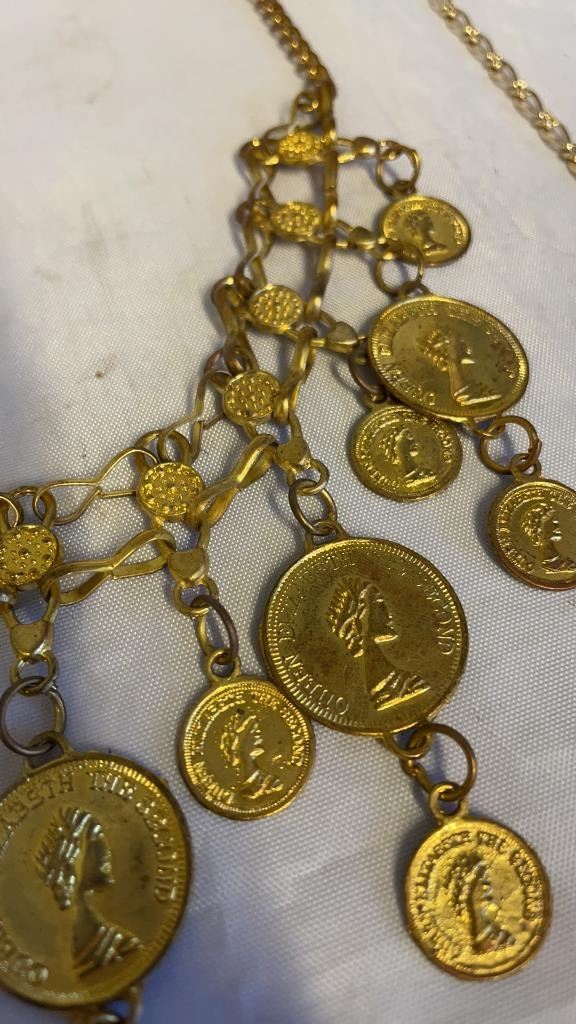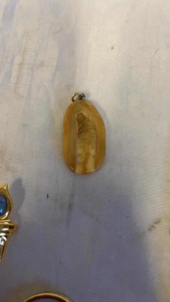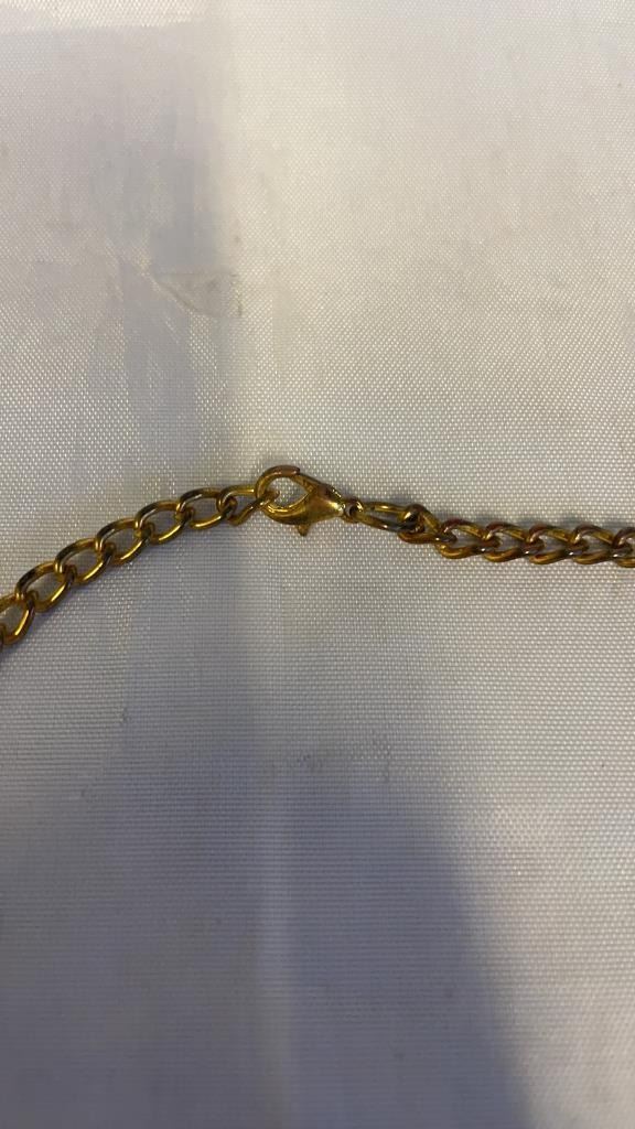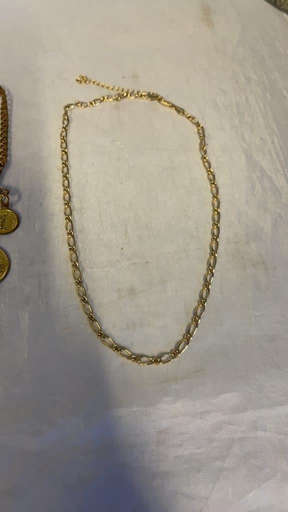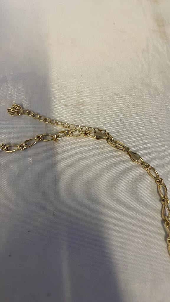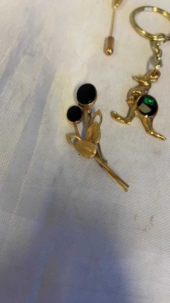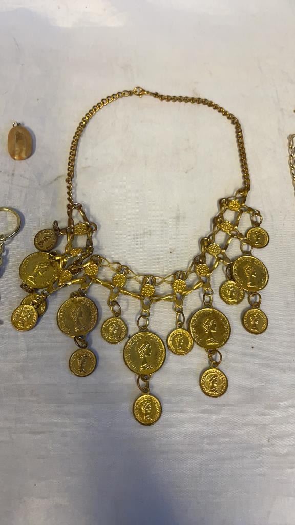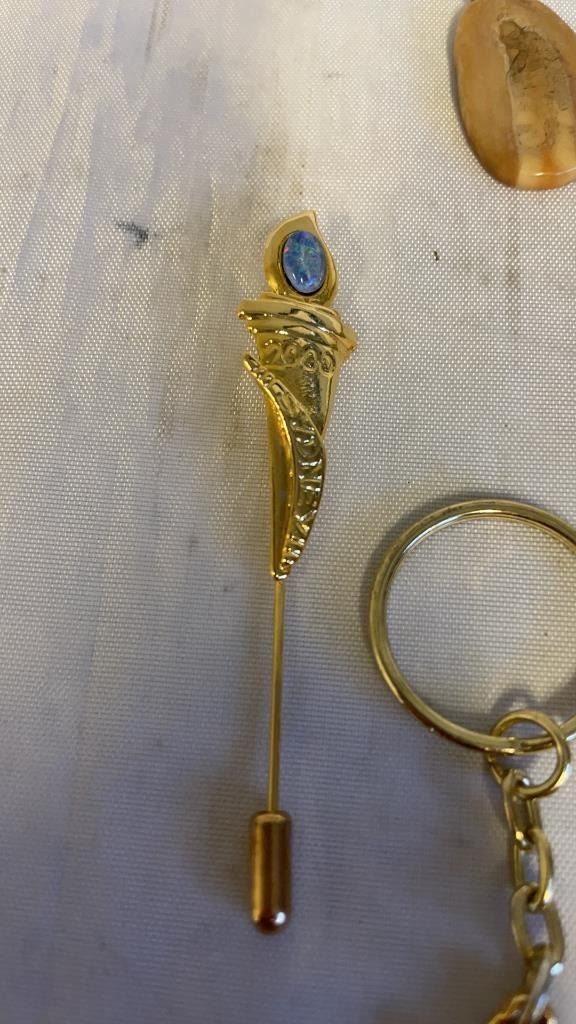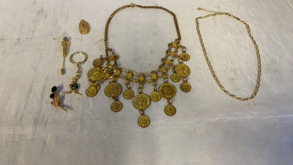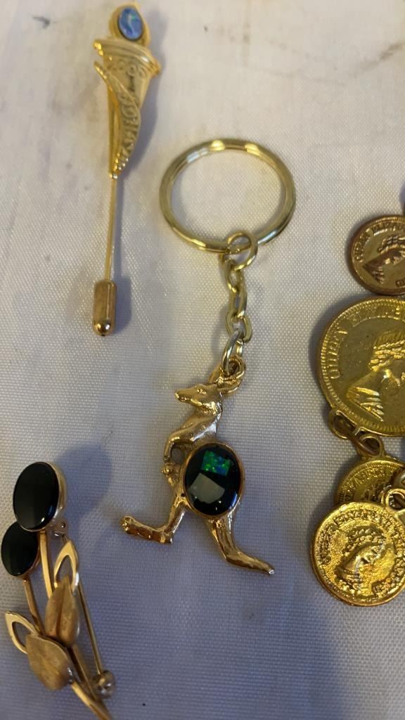 BAG OF MISC. GOLD TONE JEWLERY - 2 NECKLACES, KEYCHAIN, 2 PINS, AND WOOD PENDANT