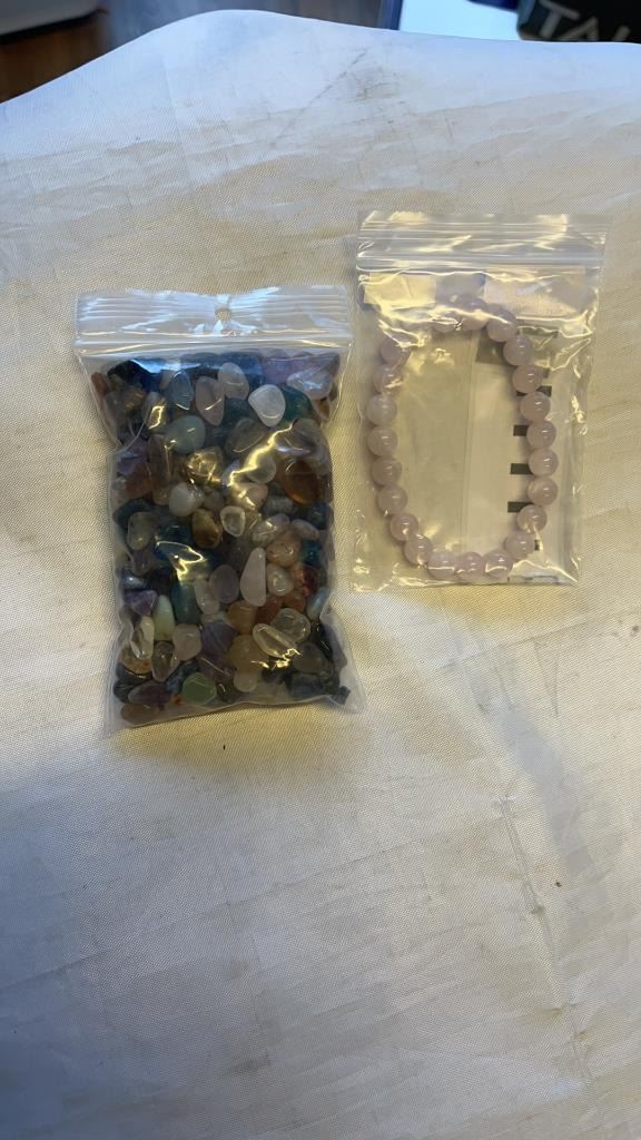 BAG OF MIXED CRYSTAL AND STONES WITH ROSE QUARTZ BRACELET