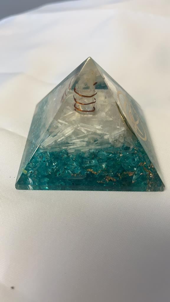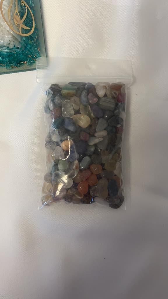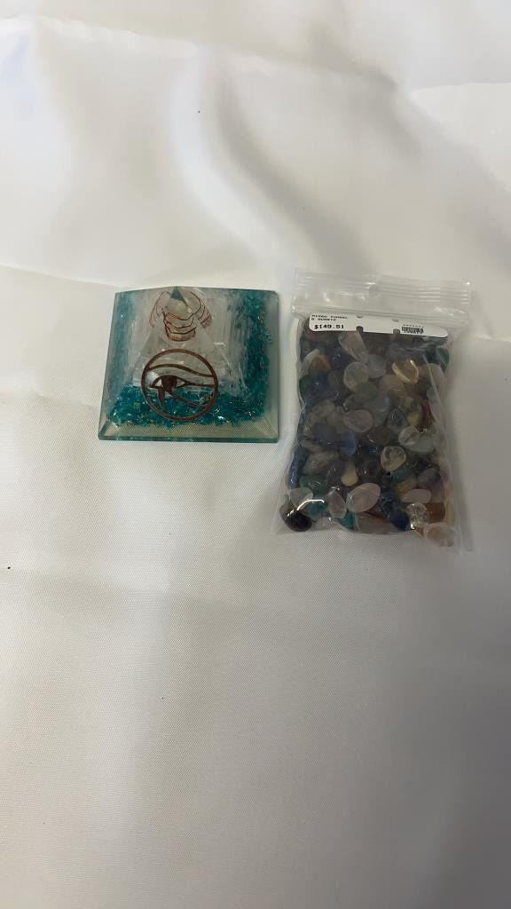 BAG OF MIXED TUMBLED QUARTZ AND SELENITE PYRAMID