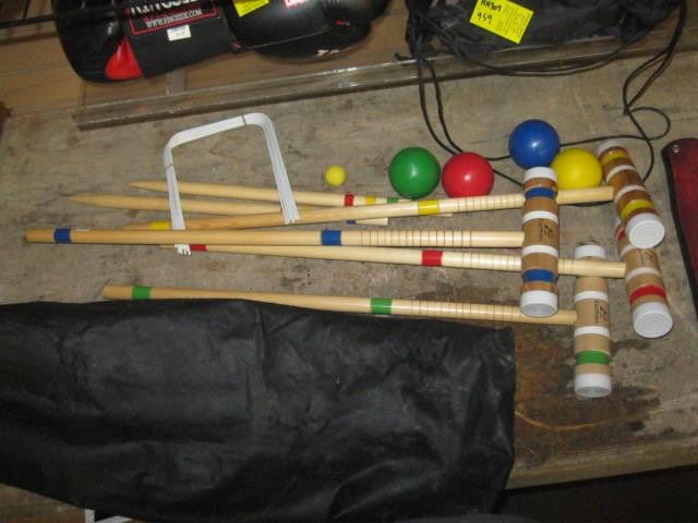 BAG W/CROQUET MALLETS, BALLS, ETC.