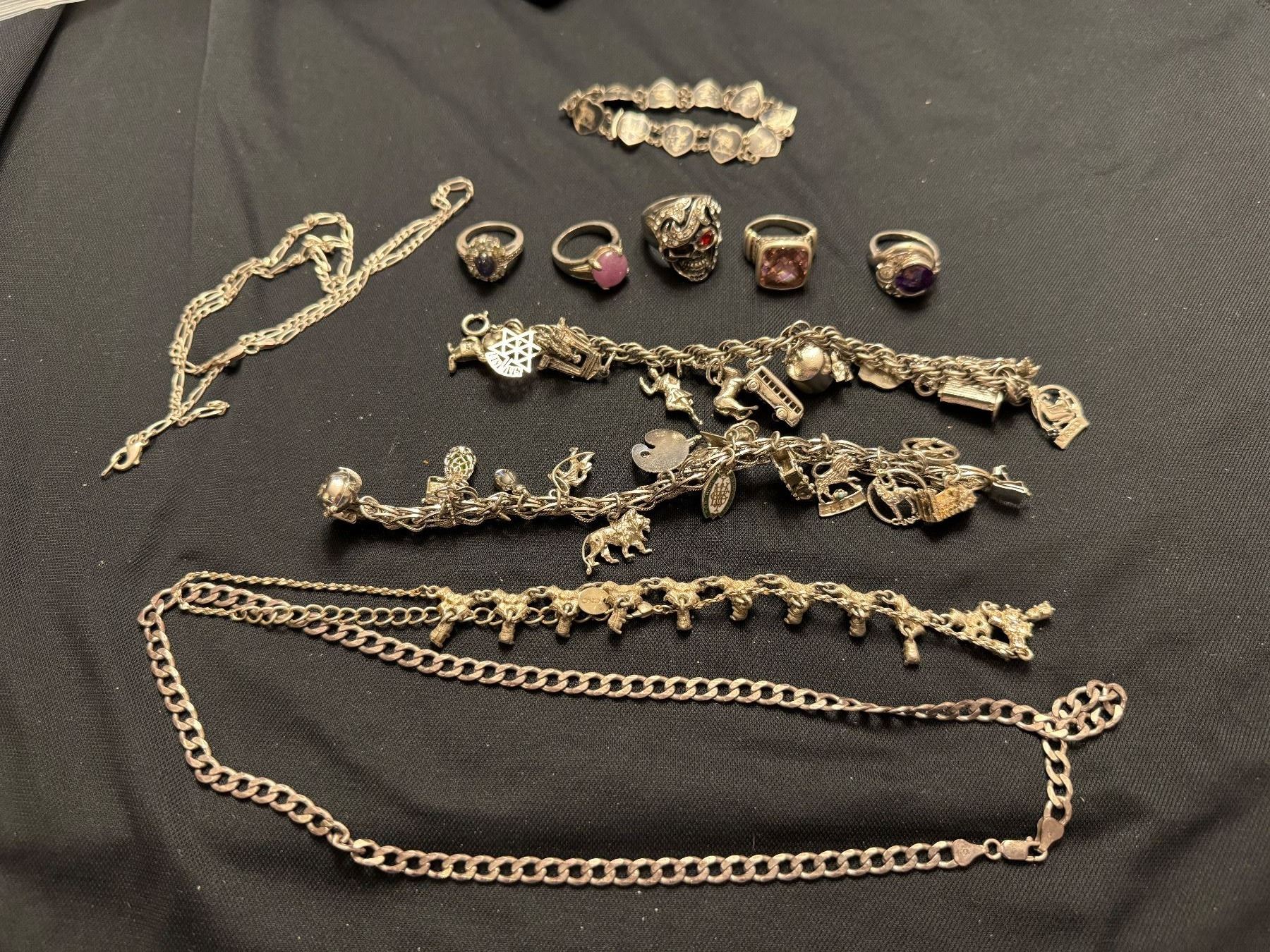 BAG WITH ASSORTED SILVER AND SILVER COLOURED JEWELRY