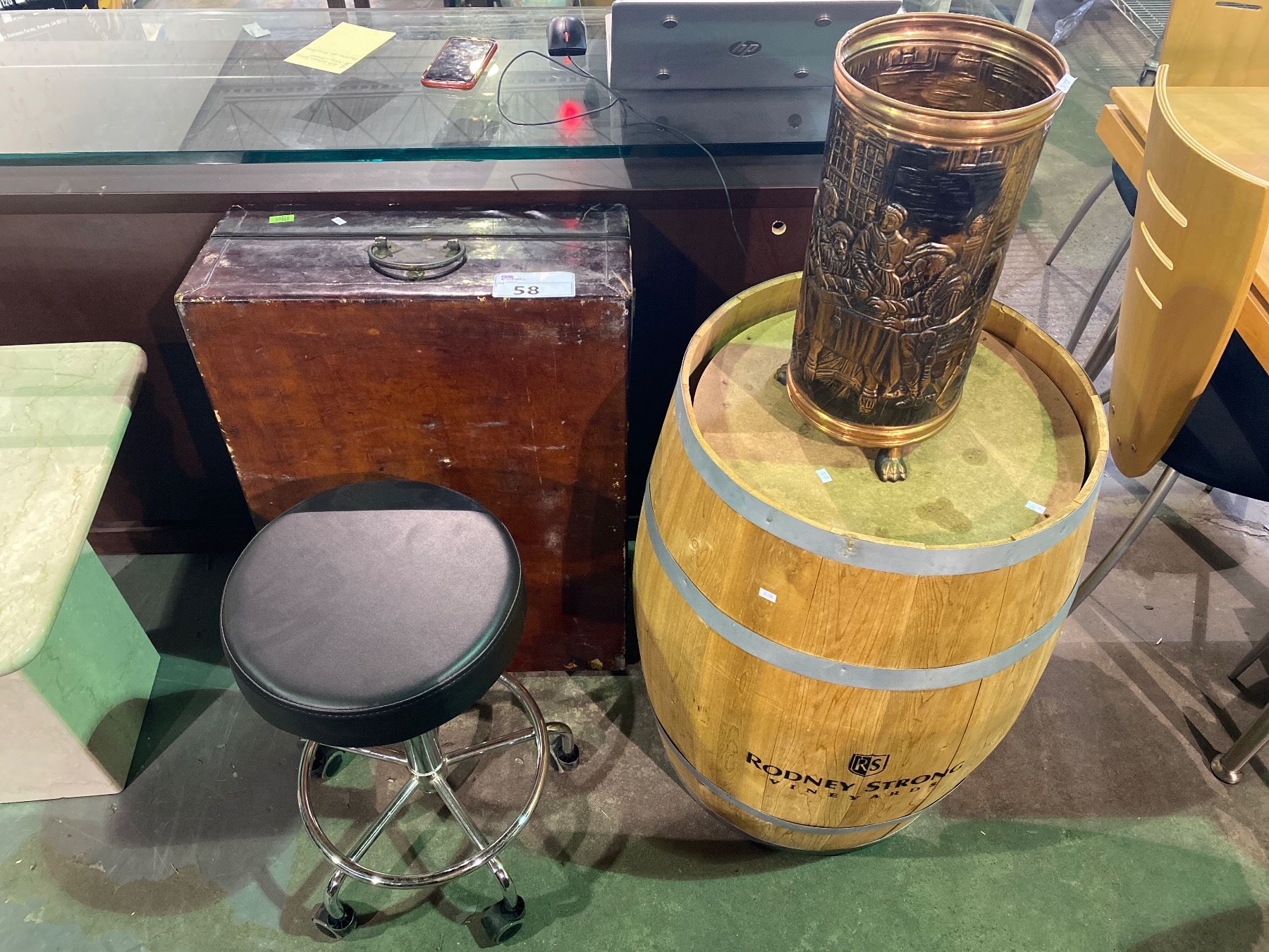 BARREL, ROLLING STOOL, TRUNK, & COPPER CLAWFOOT UMBRELLA HOLDER