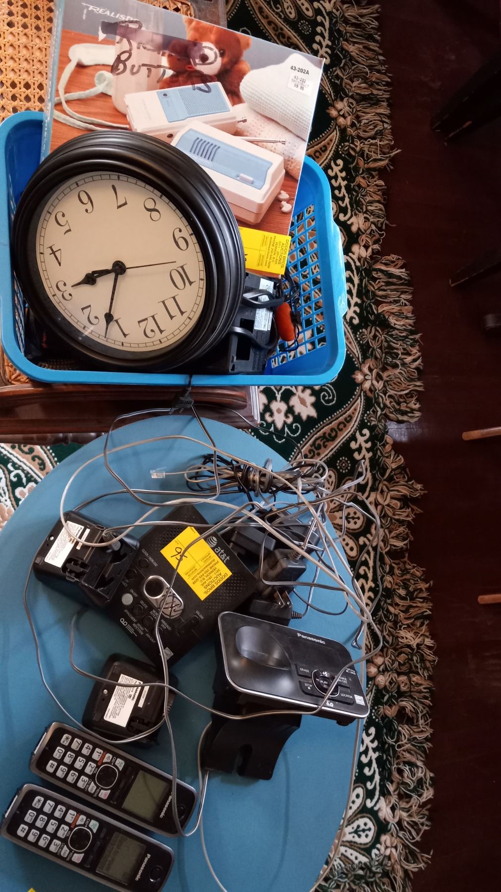 BASKET OF MISC. CLOCKS, ROOM MONITORS, TELEPHONES, ETC.