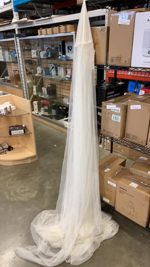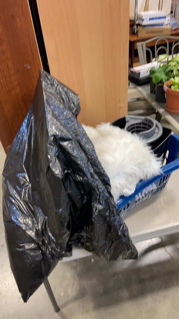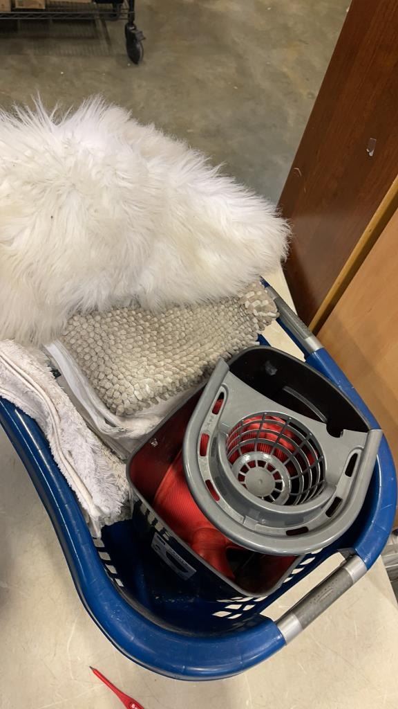BASKET OF SHEEPSKIN RUG, 2 BED CANOPIES MOP BUCKET AND MORE
