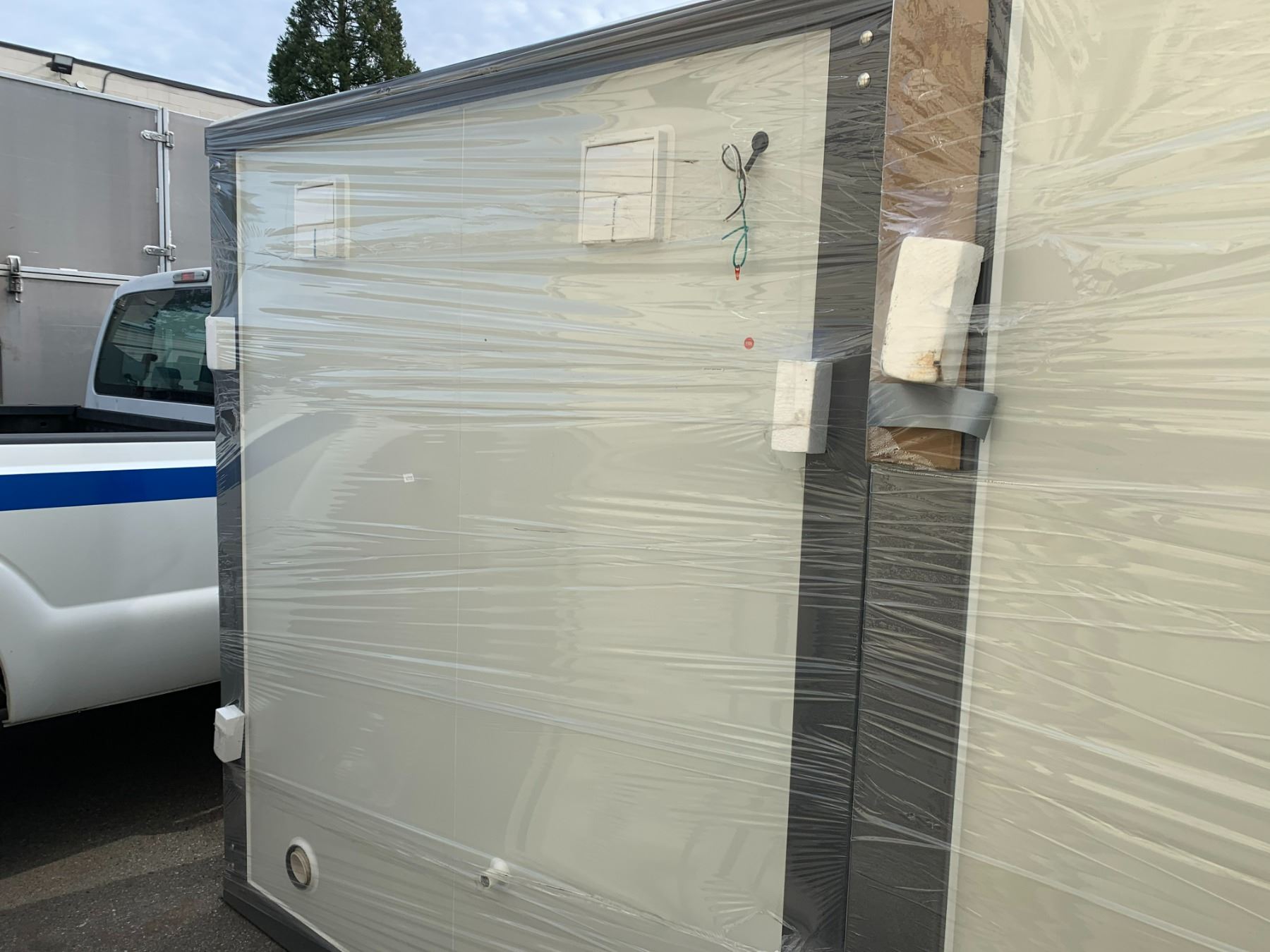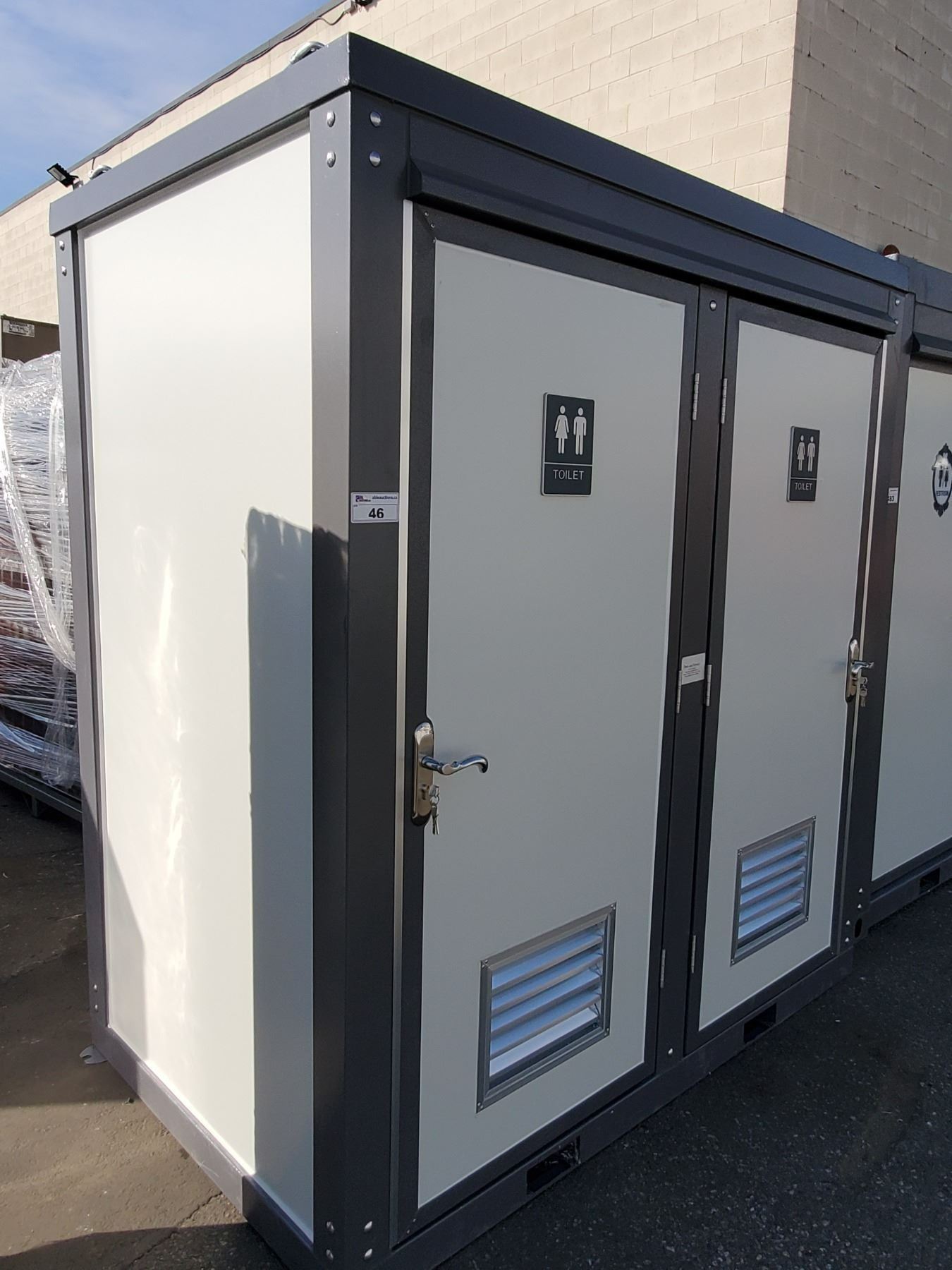 BASTONE LOCKING PORTABLE MOBILE DOUBLE TOILET HOUSE, WITH TWO TOILETS, TWO SINKS, LIGHTING, & SANITARY DISPENSERS 2.15M W X 1.3M L X 2.36M H