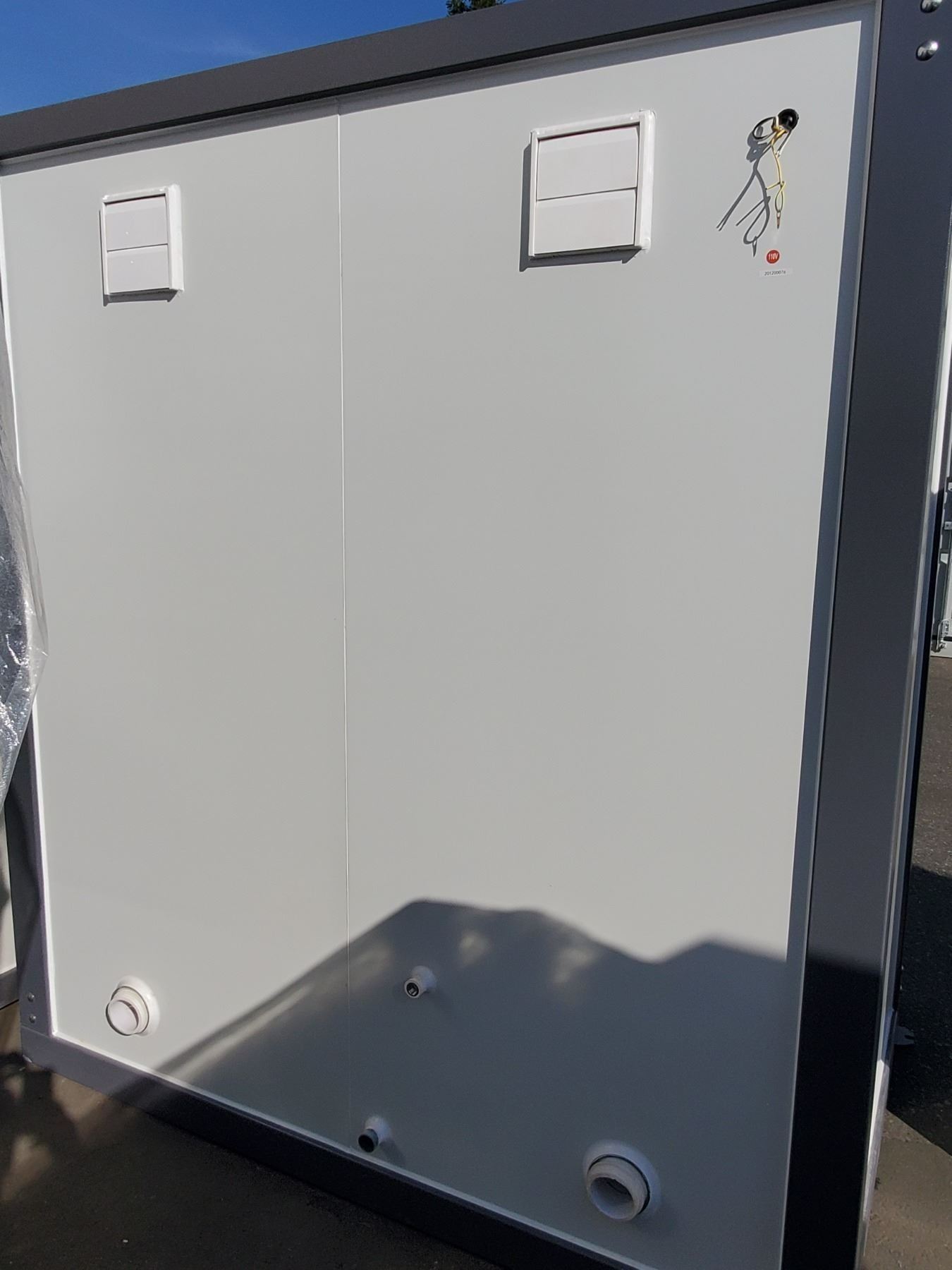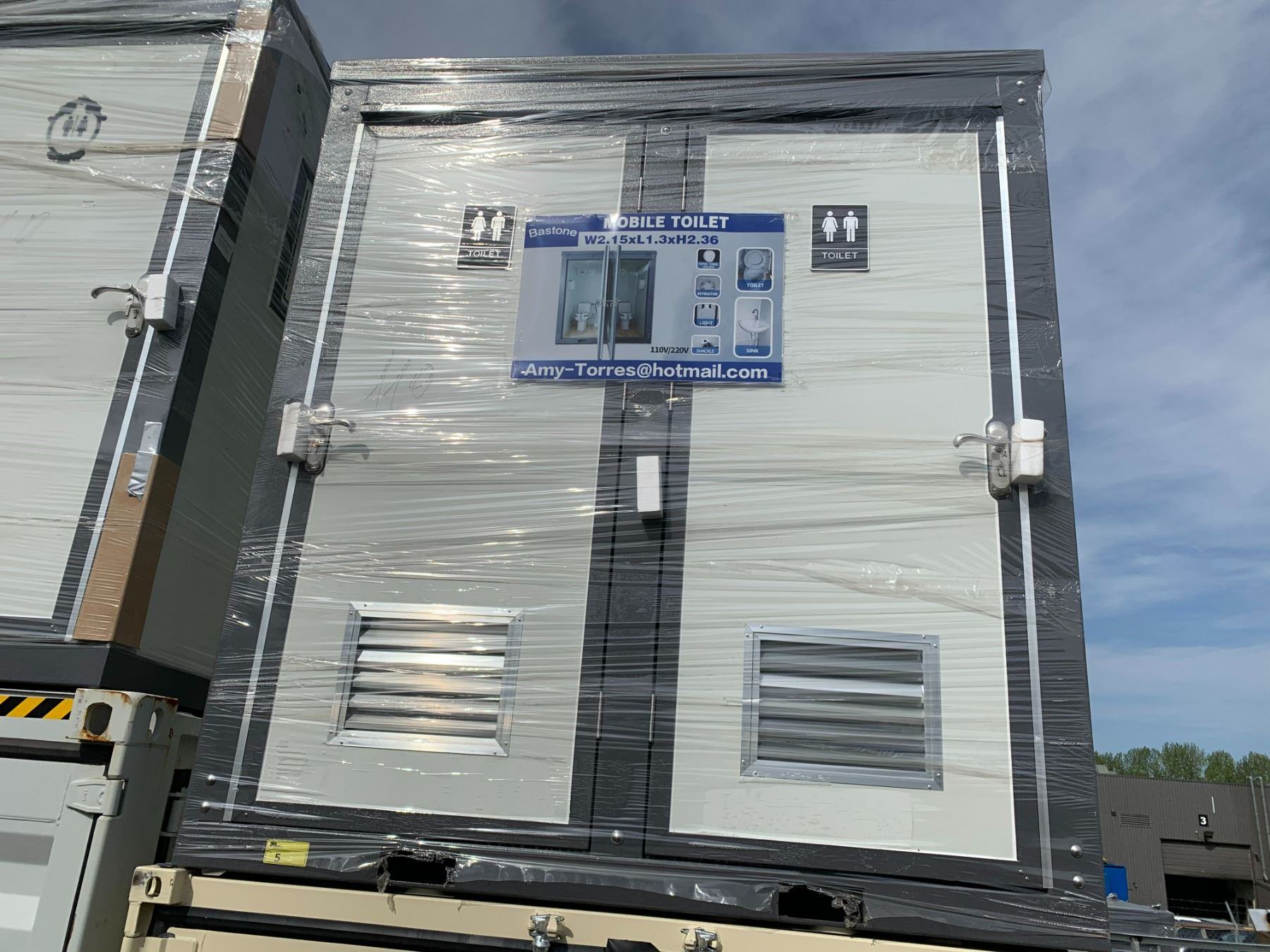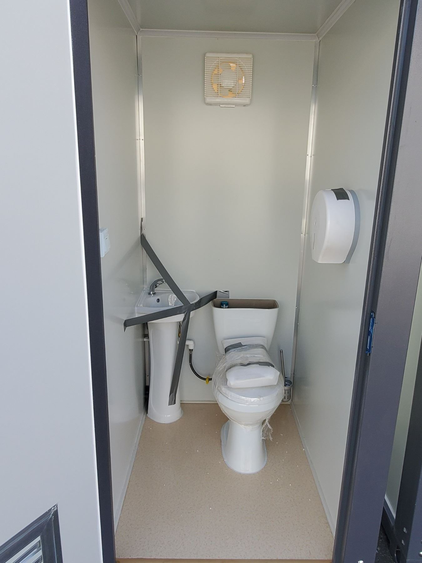 BASTONE LOCKING PORTABLE MOBILE DOUBLE TOILET HOUSE, WITH TWO TOILETS, TWO SINKS, LIGHTING, & SANITARY DISPENSERS 2.15M W X 1.3M L X 2.36M H