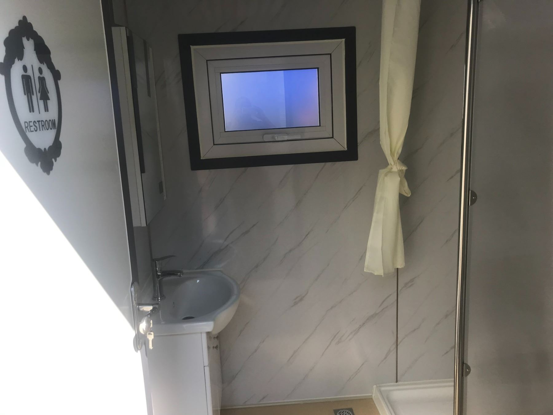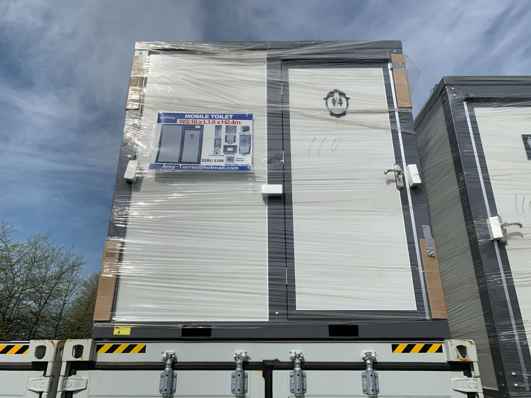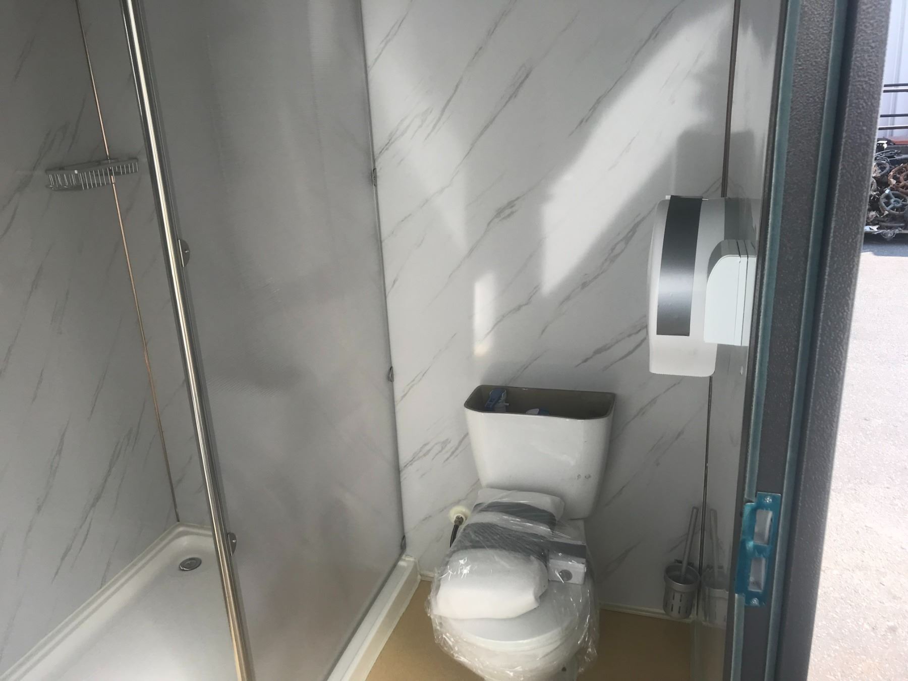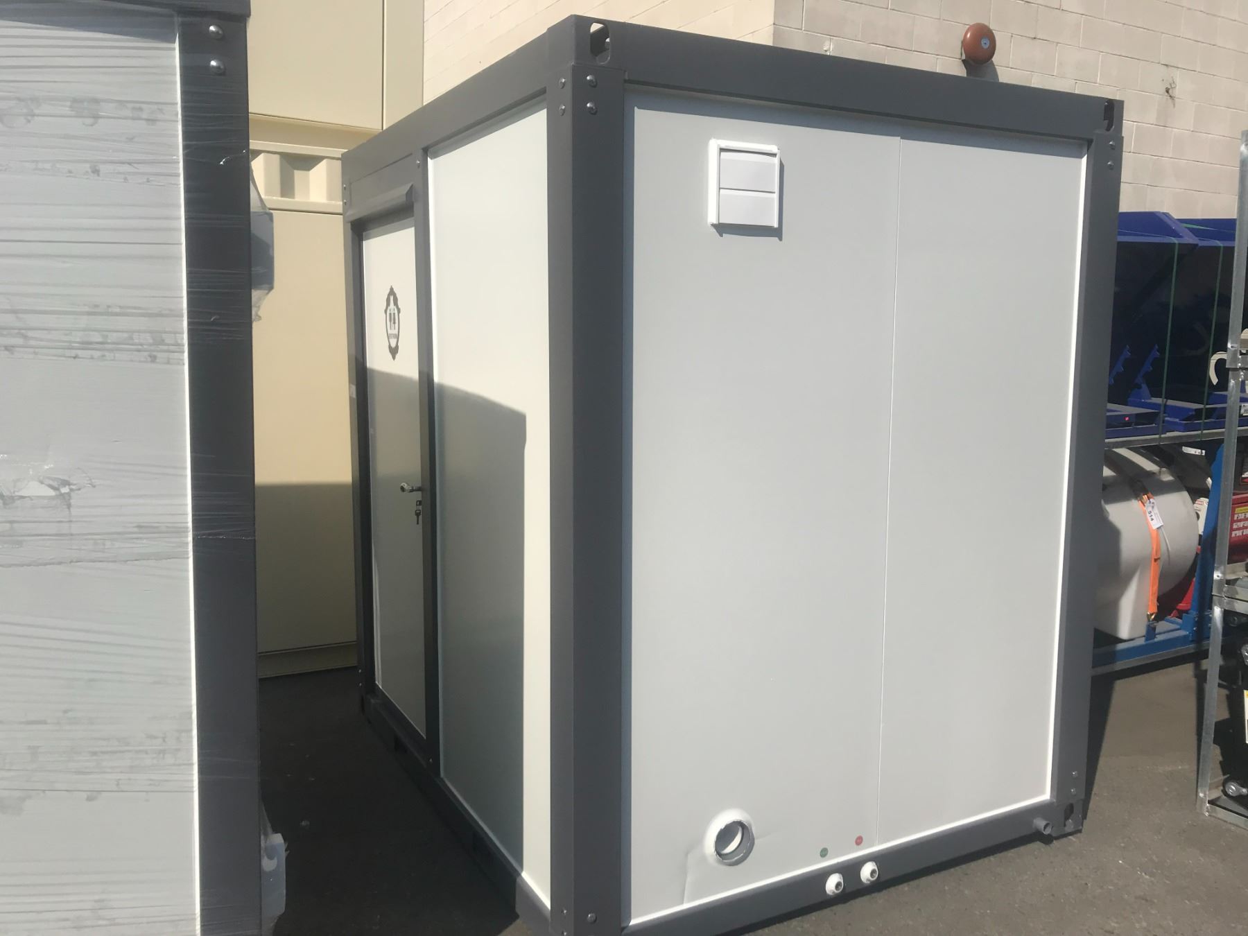 BASTONE LOCKING PORTABLE MOBILE SINGLE TOILET BATHHOUSE, WITH ONE TOILET, ONE SINK, SHOWER LIGHTING, & SANITARY DISPENSERS 2.16M W X 1.6M L X 2.4M H