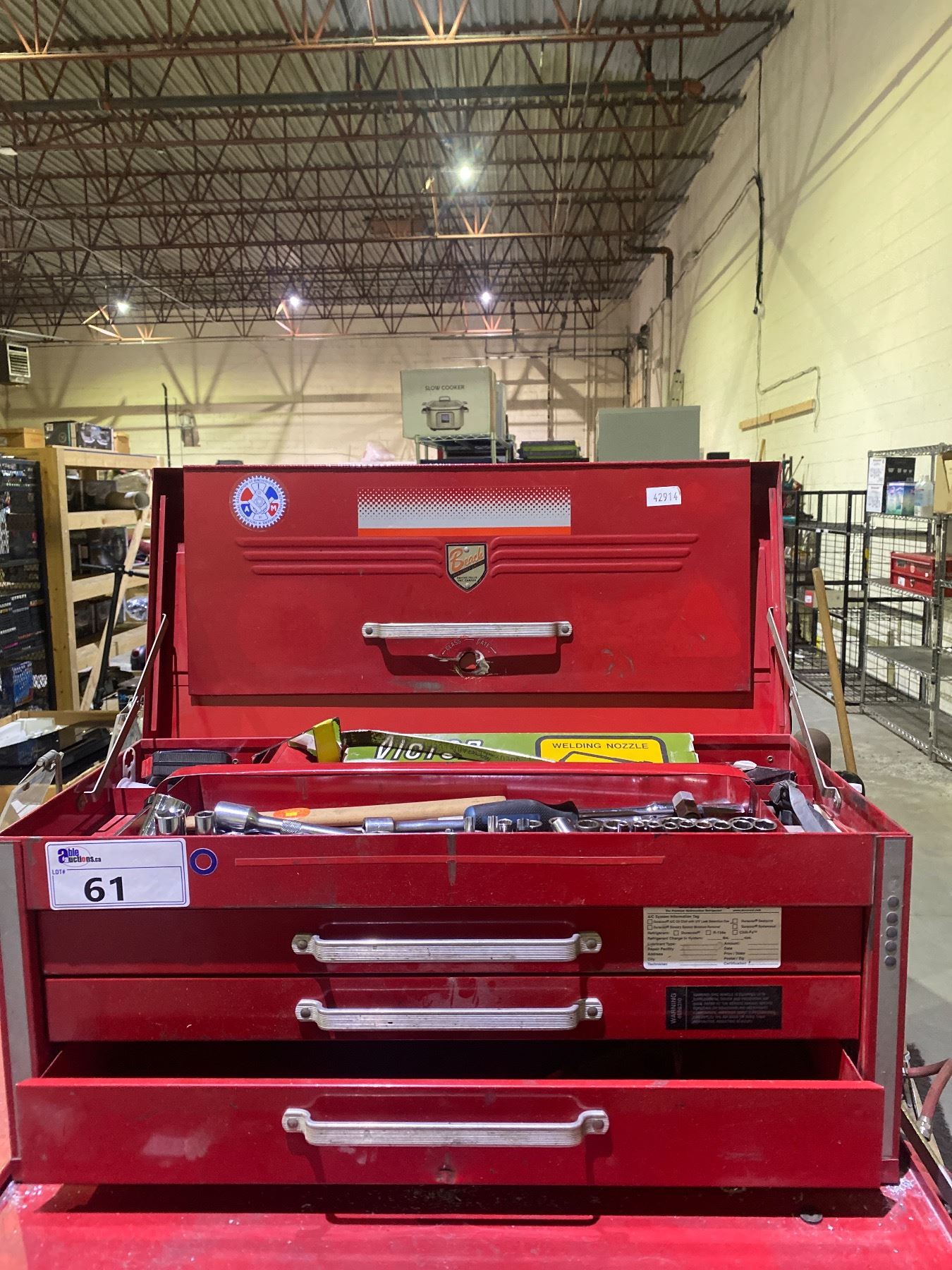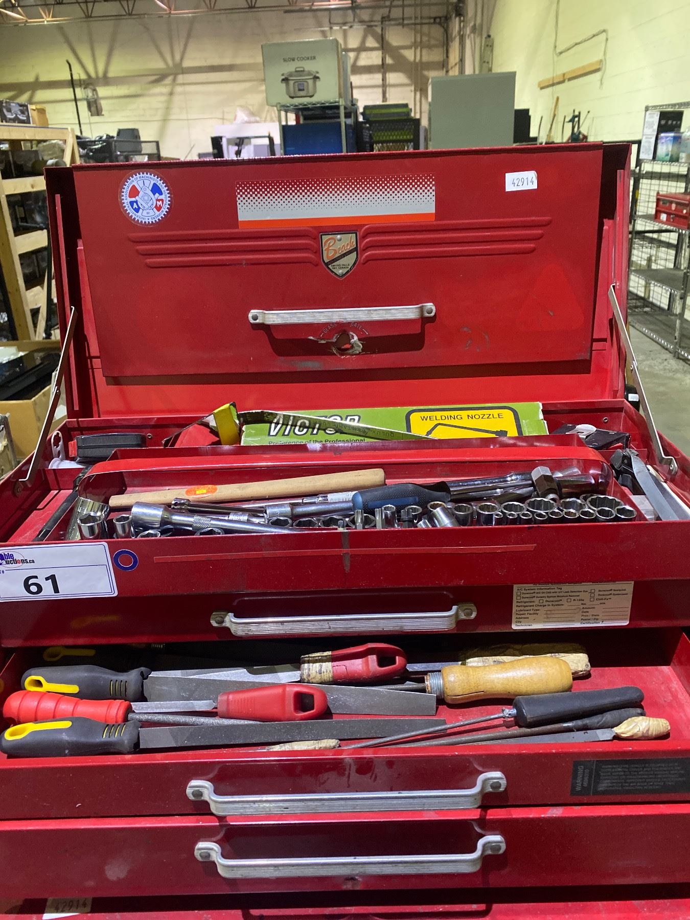 BEACH 3 DRAWER TOOLBOX WITH ASSORTED TOOL CONTENTS, SOCKETS, EXTENSIONS, CHISELS, PUNCHES, FILES, AND MORE