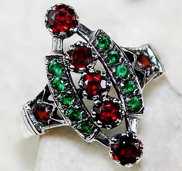 BEAUTIFUL NATURAL 1 CTTW TSAVORITE GARNET AND RHODOLITE RED GARNET RING. MOUNTED IN ELABORATELY DESIGNED SOLID .925 STERLING SILVER SIZE 6. 12.5 CTTW OR TOTAL GRAM WT IS 2.6 GRAMS. VERY PRETTY RING.BRILLIANT CLARITY AND SPARKLE