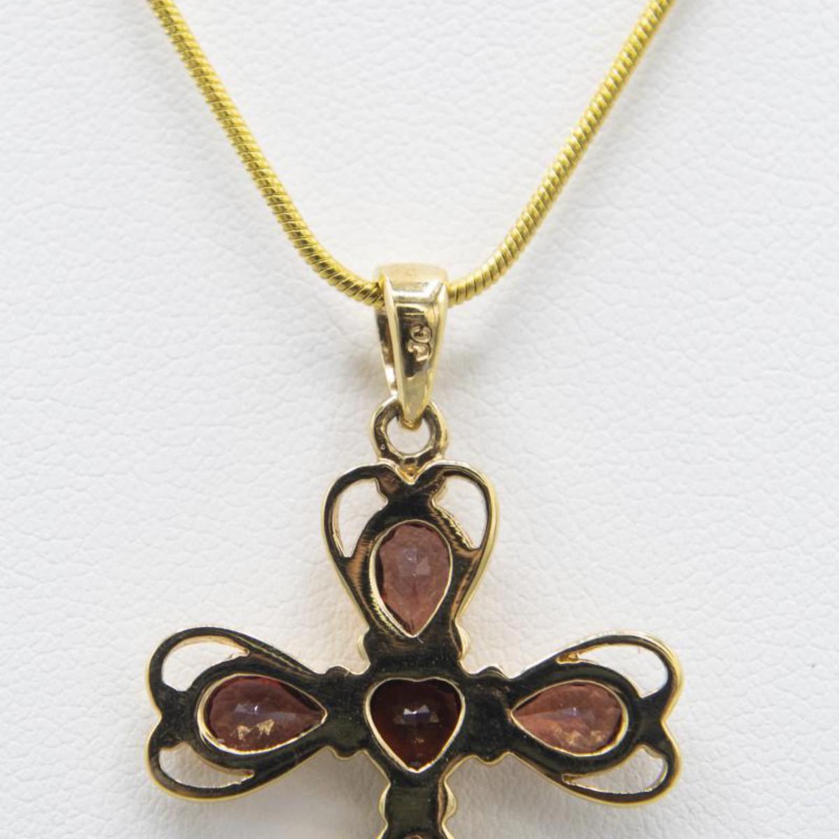 BEAUTIFUL 14 KT GOLD PLATED CROSS PENDANT. ACCENTED WITH EYE CLEAN GARNETS HANGING FROM AN 18 " CHAIN.HASD A J.G. STAMP ON THE BACK SIDE. 8.9 TOTAL GRAM WEIGHT. VERY PRETTY.
