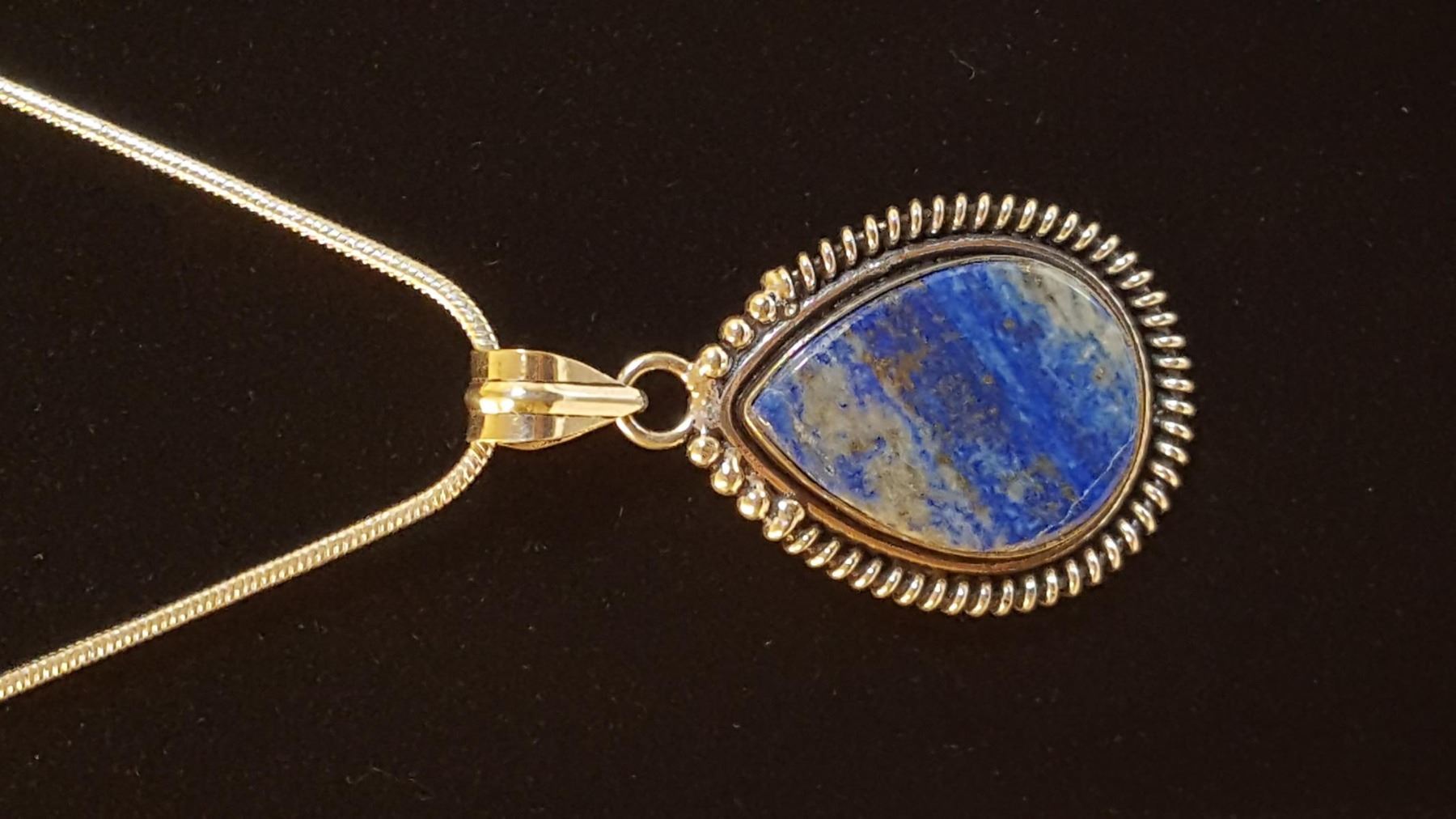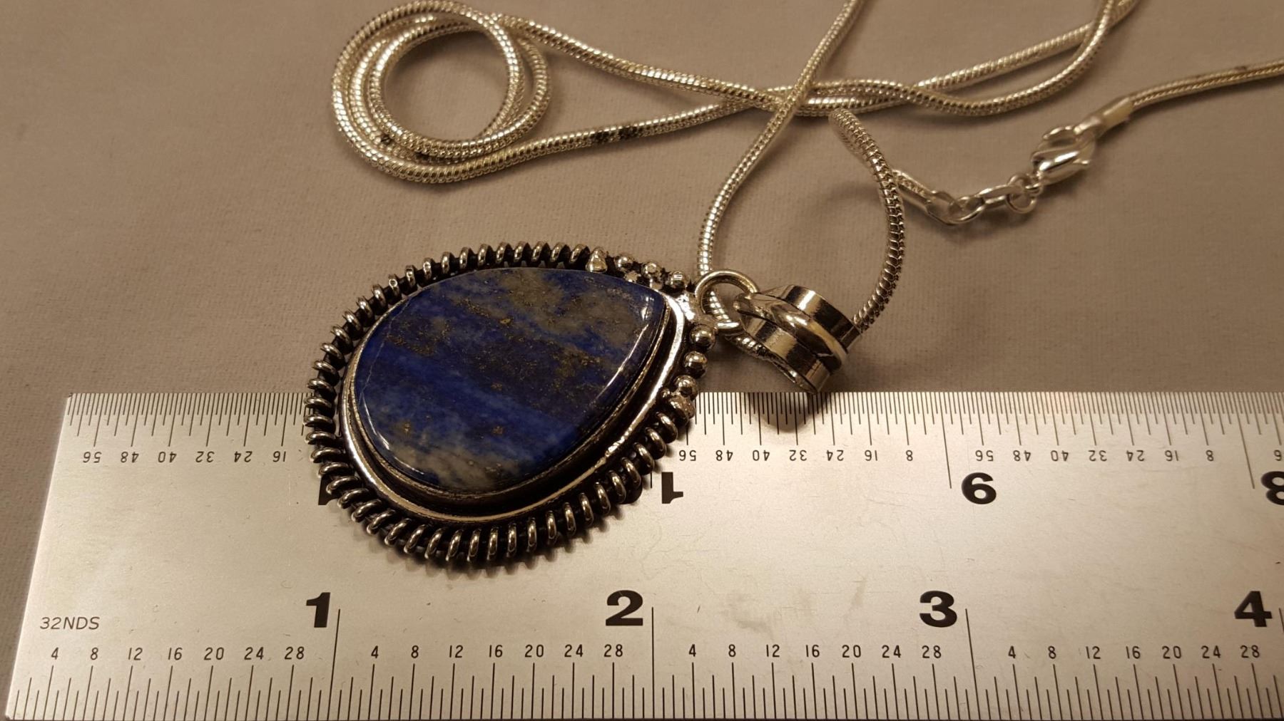 BEAUTIFUL 15 CT NATURAL SODALITE PENDANT.MOUNTED IN ELABORATLY DESIGNED .925 SOLID STERLING SILVER.106 CTTW INCLUDING THE 20 " 2 mm. CHAIN. ABSOLUTLY STUNNING. Sodalite stimulates the mind and consciousness to create enhanced intuition, creativity, and powers of analysis and observation.