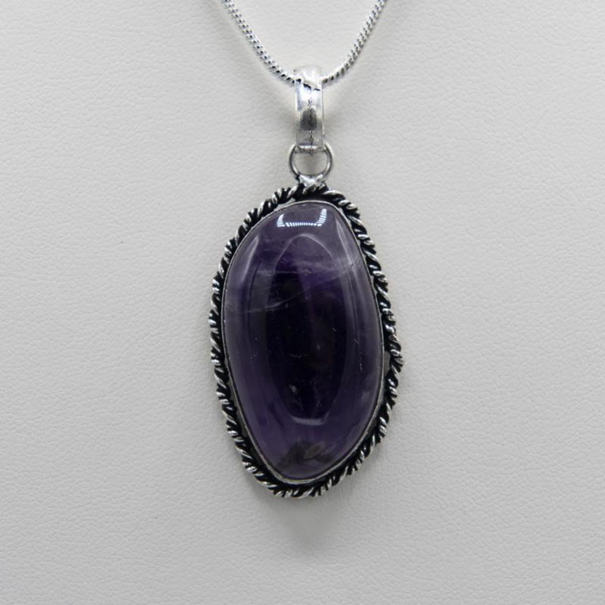 BEAUTIFUL 32 CT NATURAL AMETHYST PENDANT. BEAUTIFUL PURPLE HUE. THIS AMETHYST HAS INCREDIBLE LUSTER FINE POLISH. MOUNTED IN ELABORATELY DESIGNED .925 STERLING OVERLAY. INCLUDES 20" 2 mm. CHAIN.94 CTTW or 18.8 GRAM TOTAL WEIGHT.