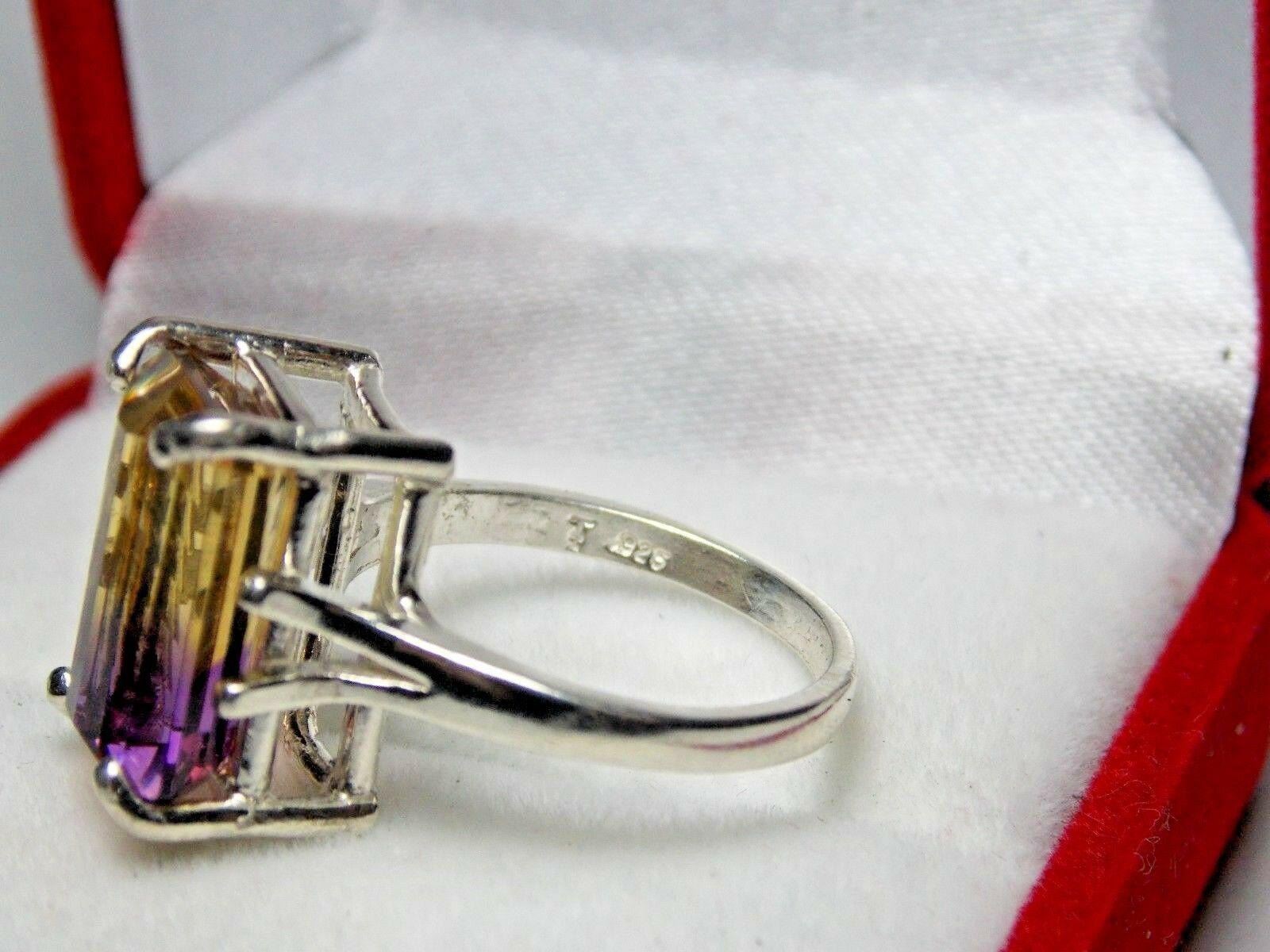 BEAUTIFUL 7.23 CT 100 % NATURAL AMETRINE RING .THIS INVESTMENT QUALITY RING IS EYE CLEAN. A BEAUTIFUL FANCY EMERALD CUT MOUNTED IN ELABORATELY DESIGNED SOLID .925 STERLING SILVER SIZE 8 TOTAL GRAM WT.IS 3.9 GRAMS. HEATED ONLY.DON'T MISS THIS NATURAL BEAUTY.