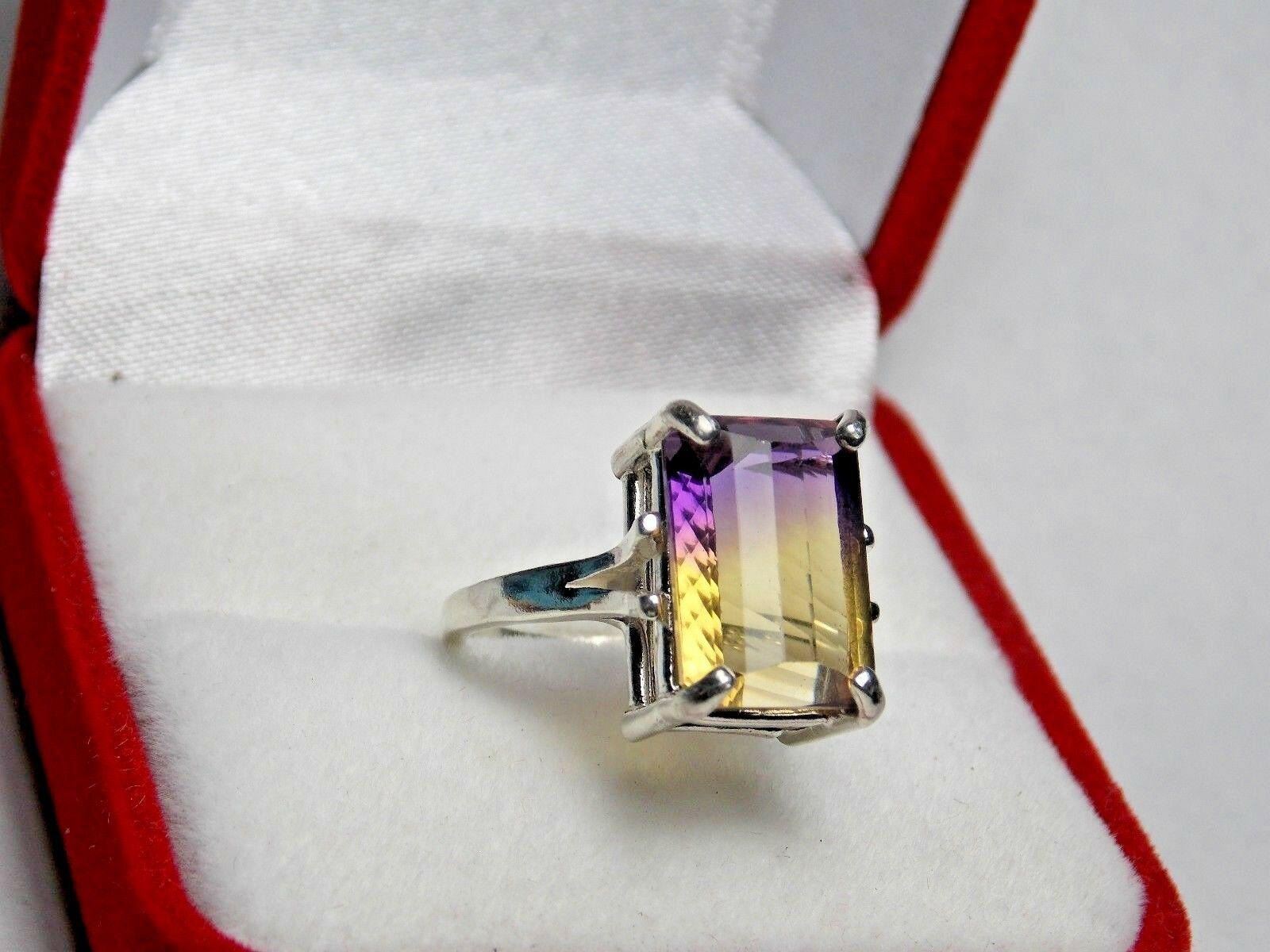 BEAUTIFUL 7.23 CT 100 % NATURAL AMETRINE RING .THIS INVESTMENT QUALITY RING IS EYE CLEAN. A BEAUTIFUL FANCY EMERALD CUT MOUNTED IN ELABORATELY DESIGNED SOLID .925 STERLING SILVER SIZE 8 TOTAL GRAM WT.IS 3.9 GRAMS. HEATED ONLY.DON'T MISS THIS NATURAL BEAUTY.