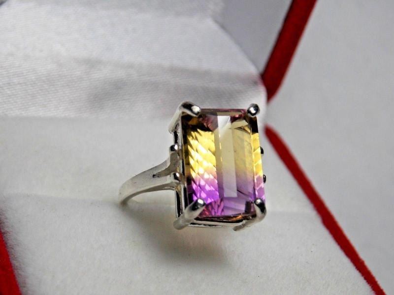 BEAUTIFUL 7.23 CT 100 % NATURAL AMETRINE RING .THIS INVESTMENT QUALITY RING IS EYE CLEAN. A BEAUTIFUL FANCY EMERALD CUT MOUNTED IN ELABORATELY DESIGNED SOLID .925 STERLING SILVER SIZE 8 TOTAL GRAM WT.IS 3.9 GRAMS. HEATED ONLY.DON'T MISS THIS NATURAL BEAUTY.