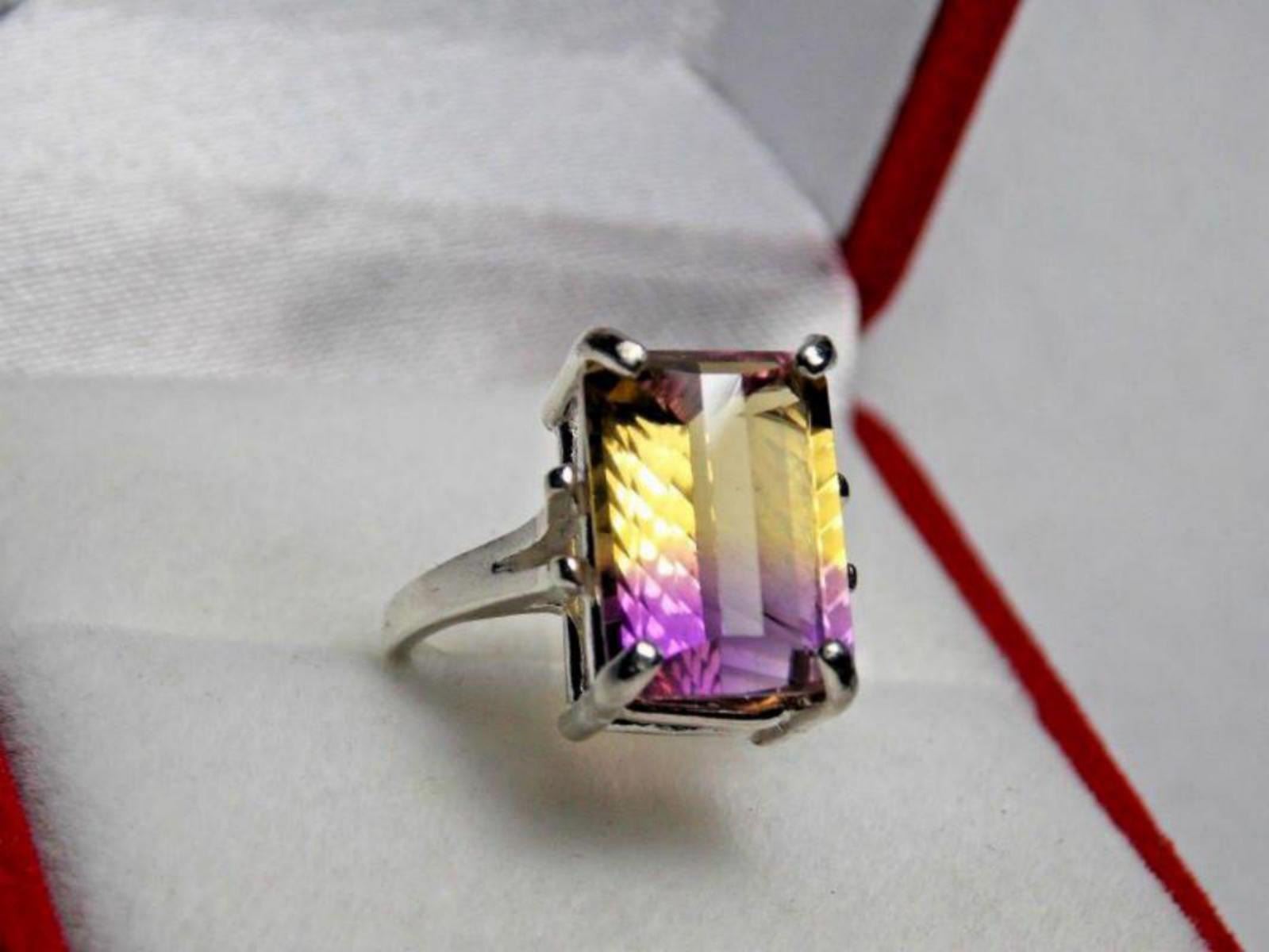 BEAUTIFUL 7.23 CT 100 % NATURAL AMETRINE RING .THIS INVESTMENT QUALITY RING IS EYE CLEAN. A BEAUTIFUL FANCY EMERALD CUT MOUNTED IN ELABORATELY DESIGNED SOLID .925 STERLING SILVER SIZE 8 TOTAL GRAM WT.IS 3.9 GRAMS. HEATED ONLY.DON'T MISS THIS NATURAL BEAUTY.