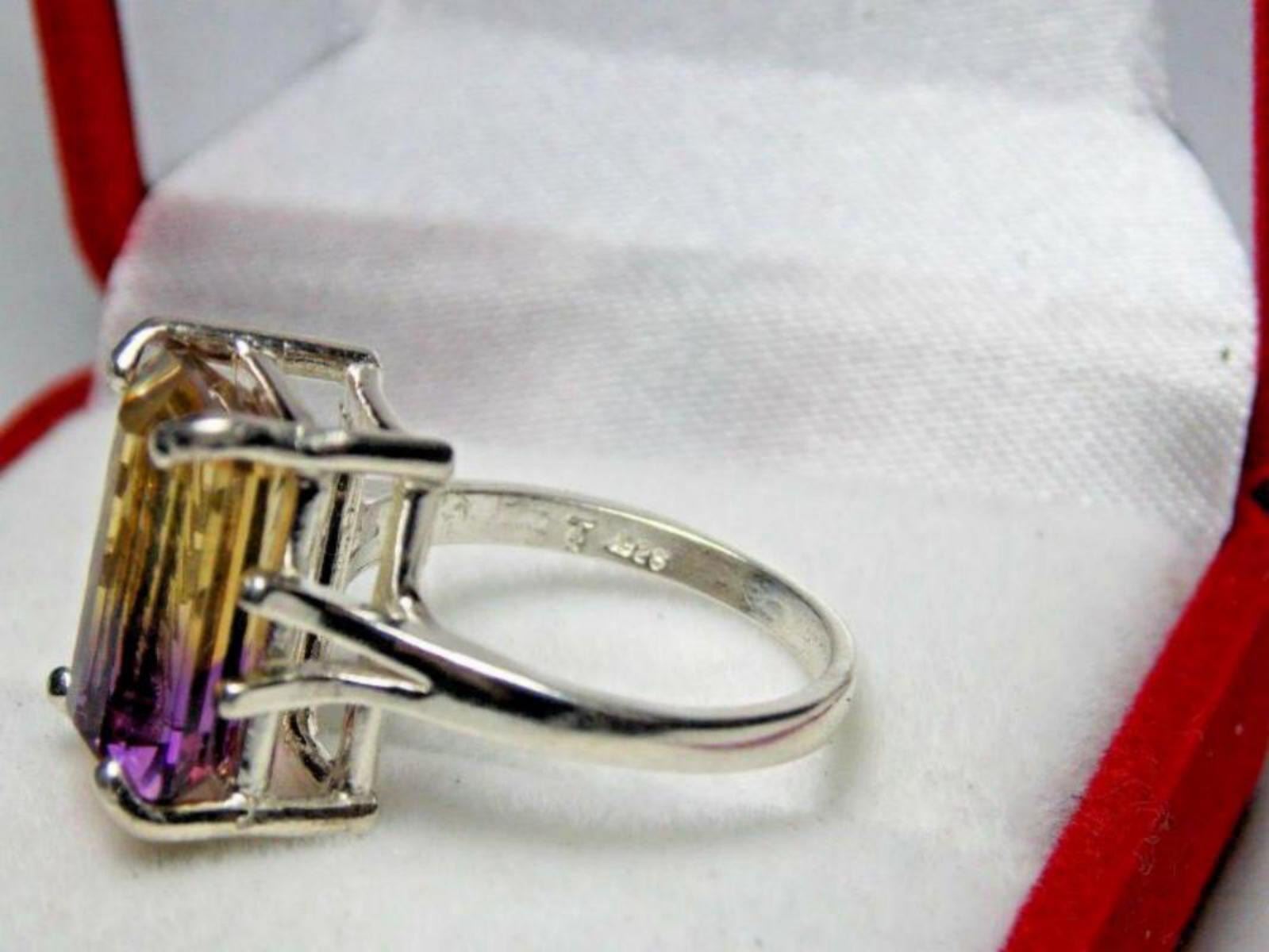 BEAUTIFUL 7.23 CT 100 % NATURAL AMETRINE RING .THIS INVESTMENT QUALITY RING IS EYE CLEAN. A BEAUTIFUL FANCY EMERALD CUT MOUNTED IN ELABORATELY DESIGNED SOLID .925 STERLING SILVER SIZE 8 TOTAL GRAM WT.IS 3.9 GRAMS. HEATED ONLY.DON'T MISS THIS NATURAL BEAUTY.