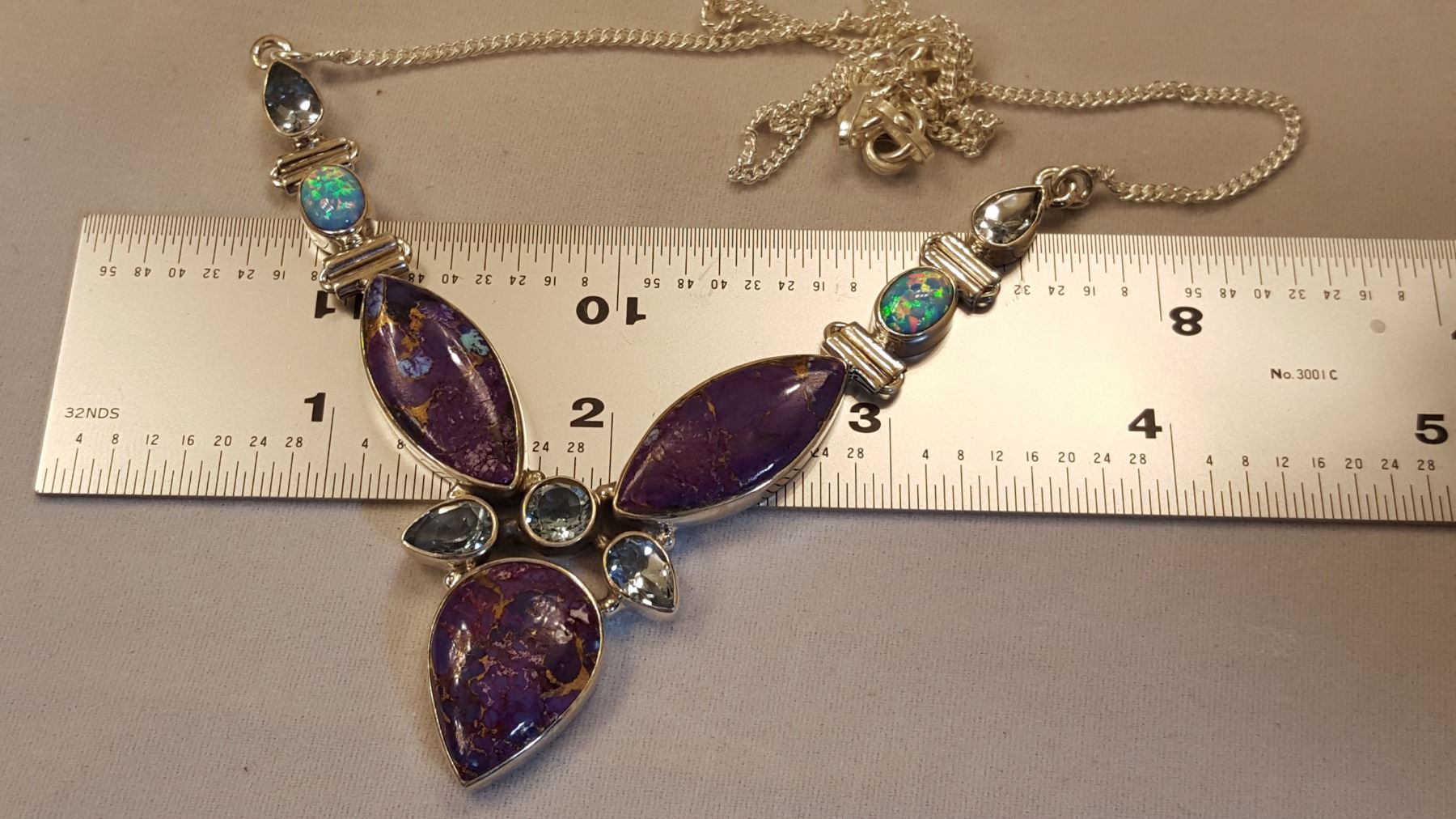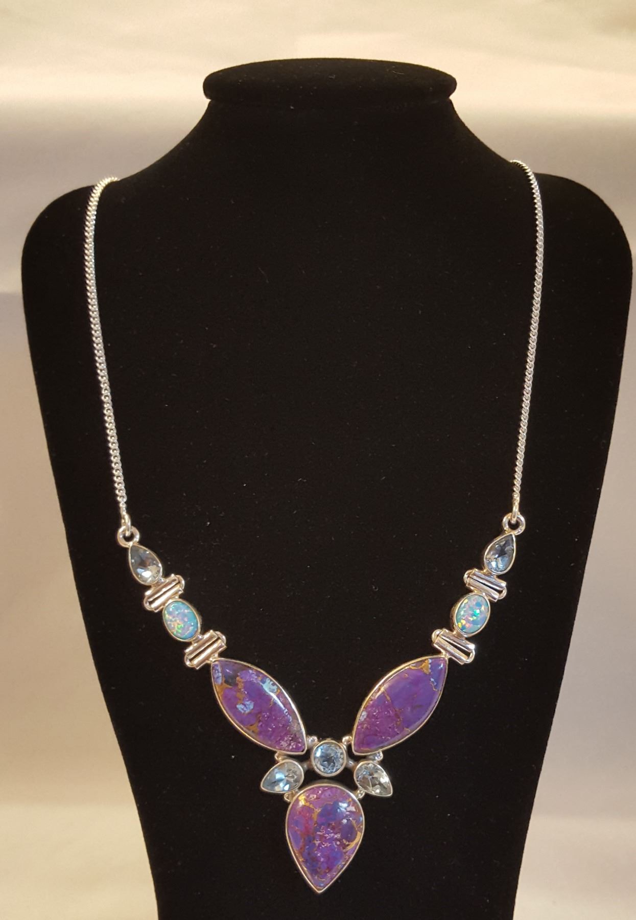 BEAUTIFUL NATURAL ARIZONA LAVENDER TURQUOISE COPPER ACCENTS NECKLACE. INCLUDES 5 SKY BLUE TOPAZ HIGHLIGHT STONES. MOUNTED IN SOLID .925 STERLING SILVER. 19 " STERLING SILVER CHAIN. 22 GRAM TOTAL WEIGHT. TURN SOME HEADS WITH THIS NECKLACE LADIES.