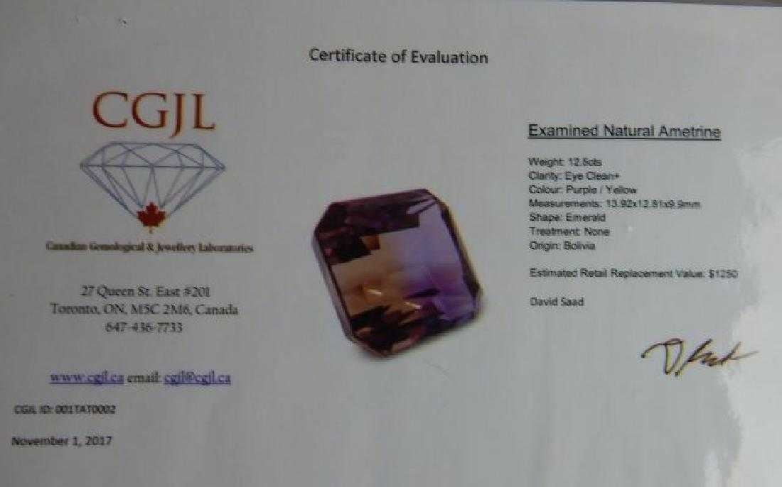 BEAUTIFUL CERTIFIED 12.5 CT RARE NATURAL UNHEATED CT BI COLOR AMETRINE. BEAUTIFUL PURPLE AND GOLD HUE AND EXCELLENT CLARITY . EYE CLEAN + . INCREDIBLE LUSTER & BRILLIANCE . FINE EMERALD CUT MEASURING 13.92 x 12.81 x 9.9 mm. BOLIVIAN PLEASE SEE CERTIFICATION FOR FURTHER DETAILS A. RARE AND ABSOLUTELY STUNNING .