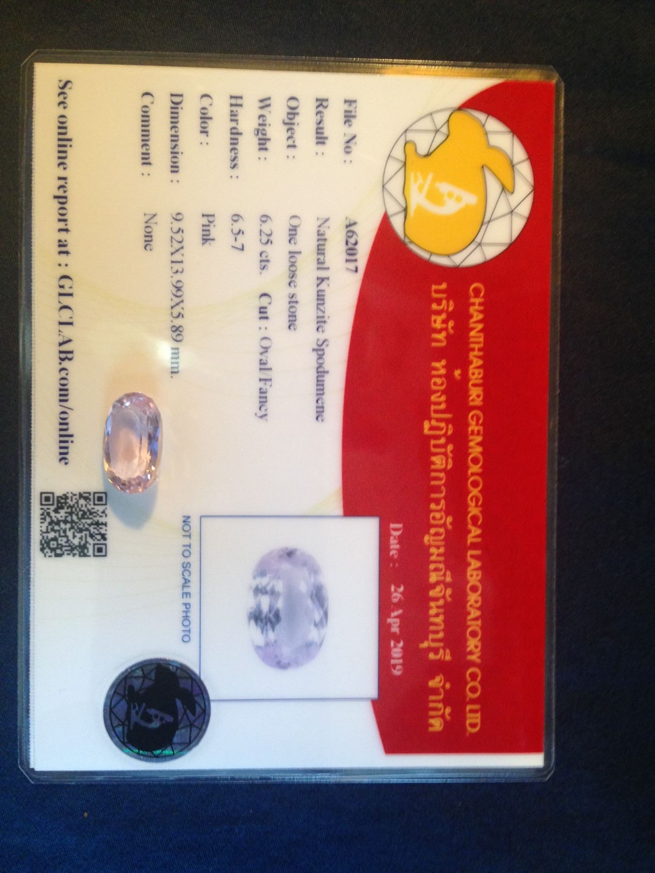 BEAUTIFUL CERTIFIED 6.25 CT NATURAL PINK KUNZITE. FINE OVAL CUT MEASURING 9.52 x 13.99 x 5.89 mm.ORIGIN IS AFGHANISTAN