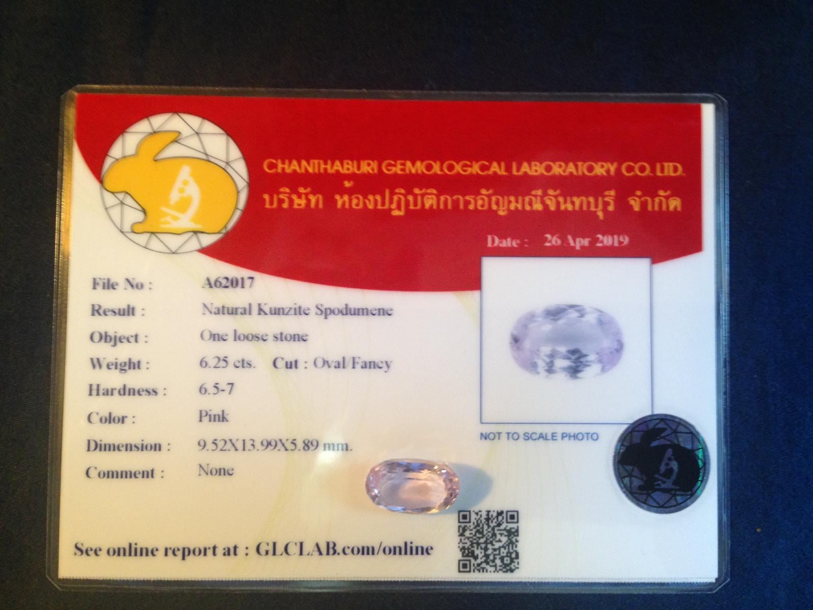 BEAUTIFUL CERTIFIED 6.25 CT NATURAL PINK KUNZITE. FINE OVAL CUT MEASURING 9.52 x 13.99 x 5.89 mm.ORIGIN IS AFGHANISTAN